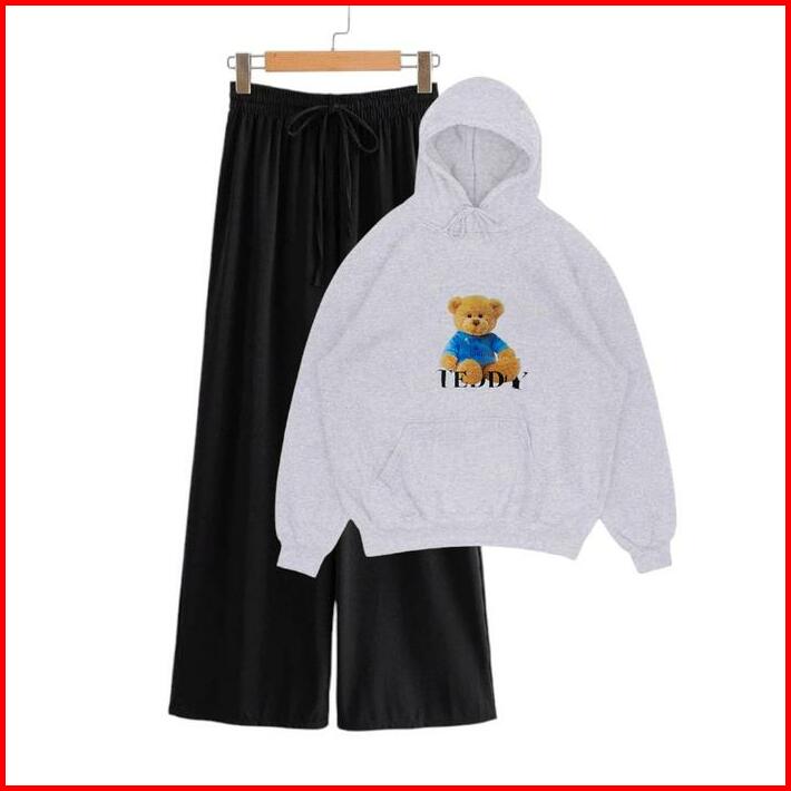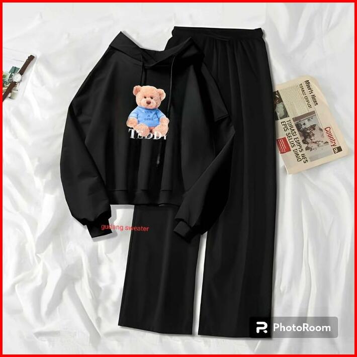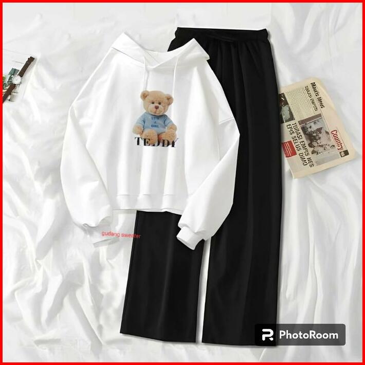 Setelan Sweater Hoodie Bear Teddy Wanita Remaja Kekinian Usia 10-16 Tahun Celana Kulot Korea Style Anak