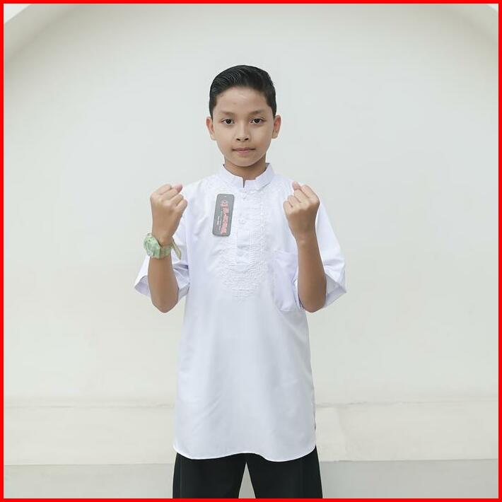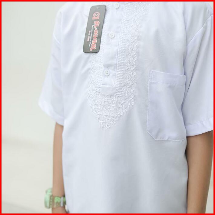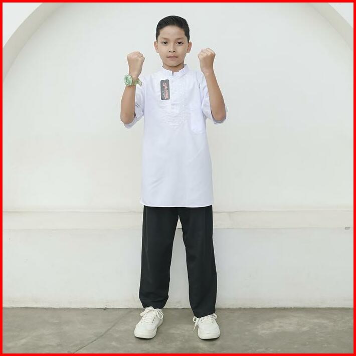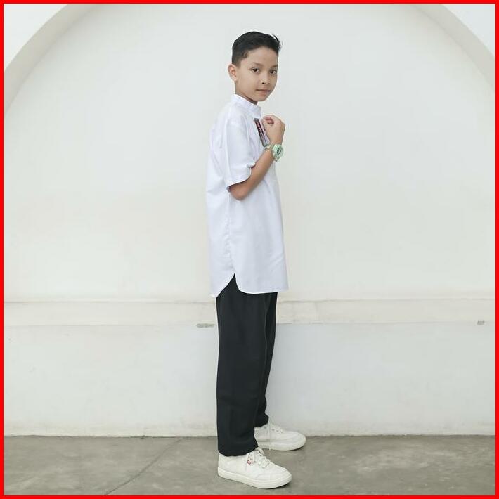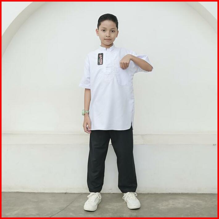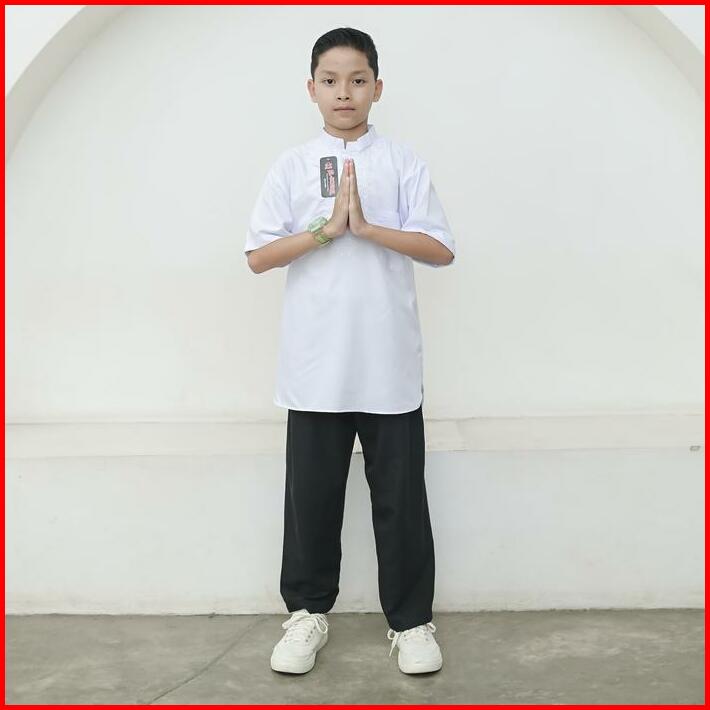 Setelan Koko Baju Putih Celana Hitam Lengan Pendek Anak Laki-laki Katun Micro Muslim