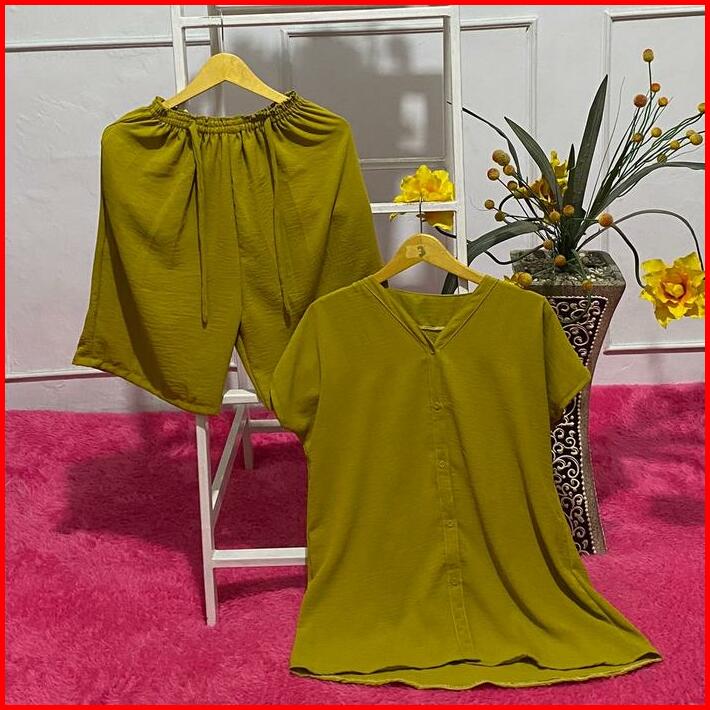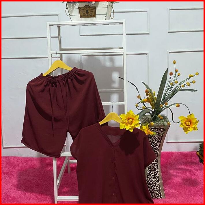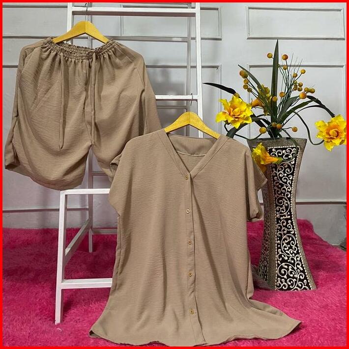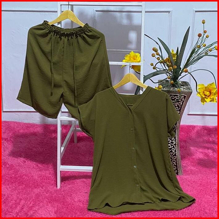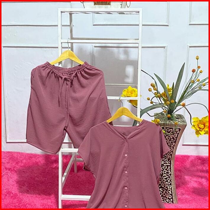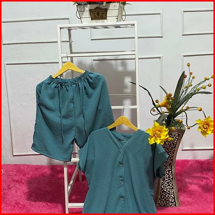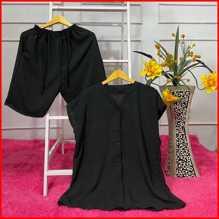 Setelan One Set Wanita Full Kancing Celana Selutut Bahan Crinckle Airflow
