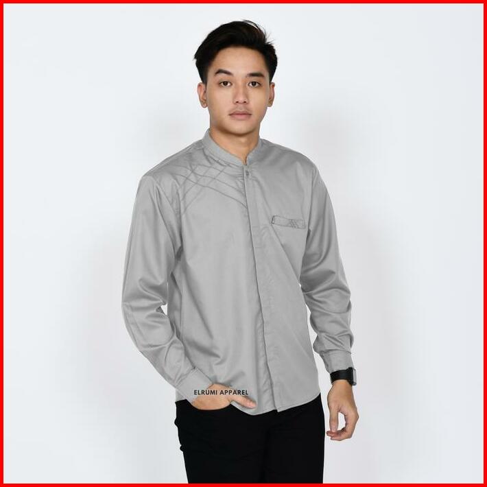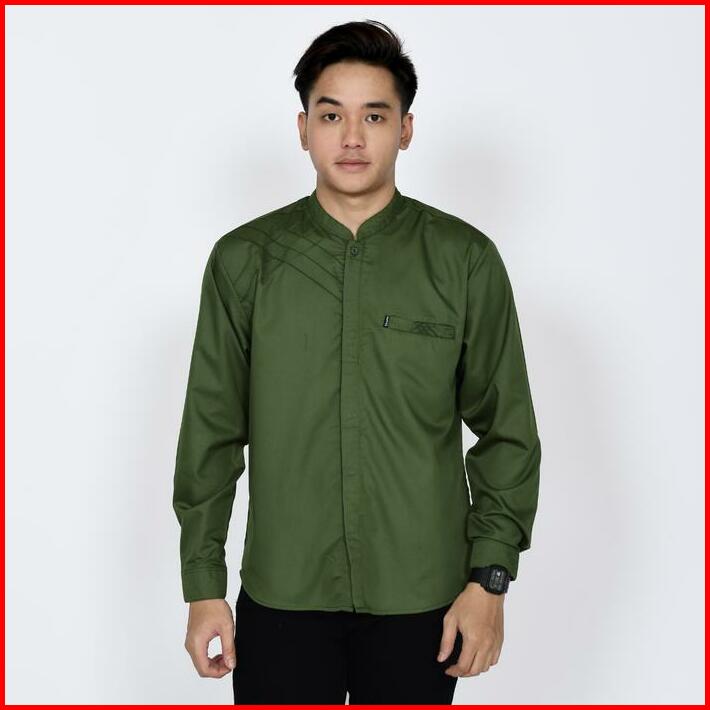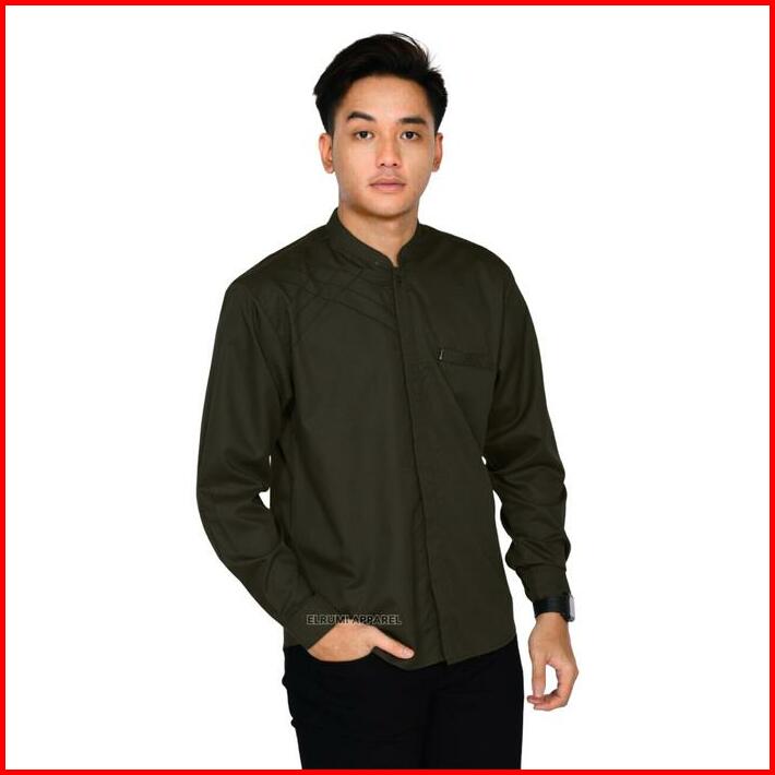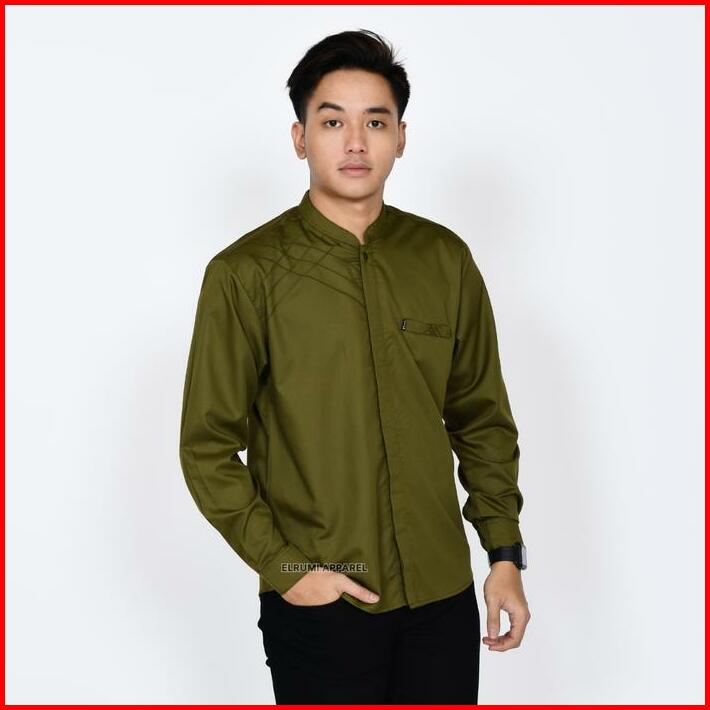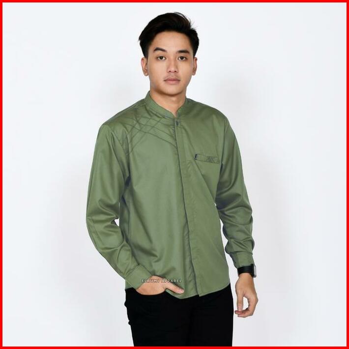 Elrumi Baju Kemeja Koko Pria Lengan Panjang Warna Hijau Olive Bahan Katun Toyobo Motif Marvel