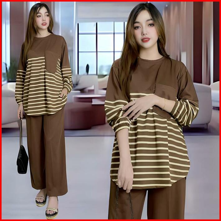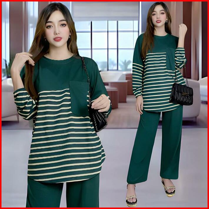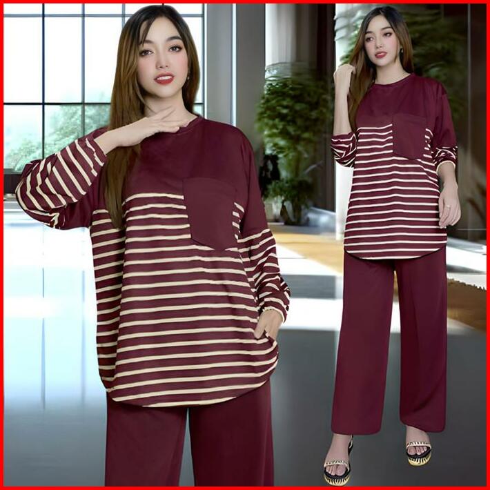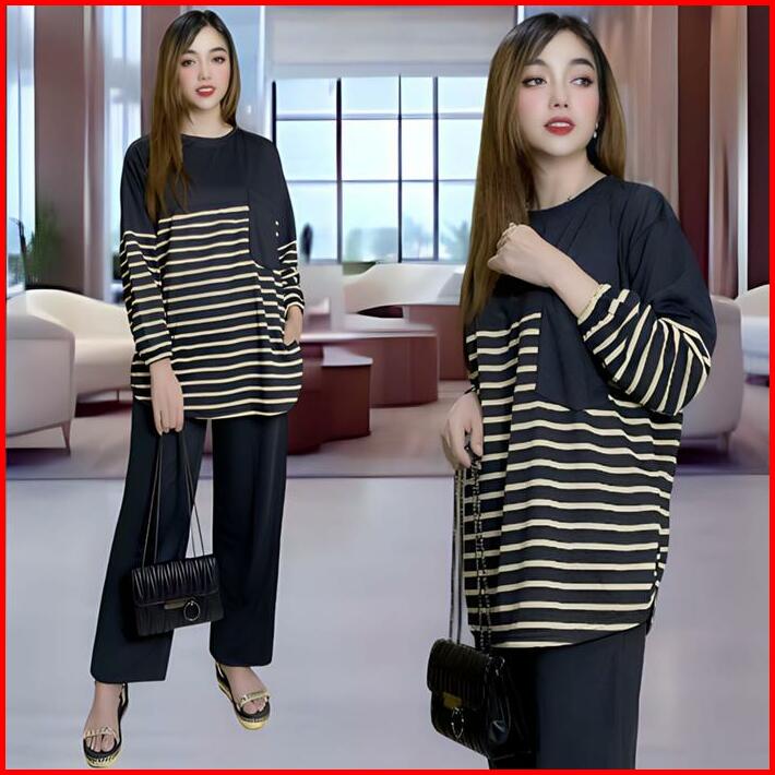Davina Oneset Atasan Oval Kantong Dada Ld 120 Vistaterry Motif Salur Celana Karet Wanita Setelan Baju Basic Panjang Over