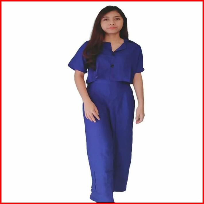 Setelan Croptop Wanita Celana Panjang Atasan Kemeja Kancing Lengan Pendek Rayon Halus Remaja Model Kekinian Santai Lembu