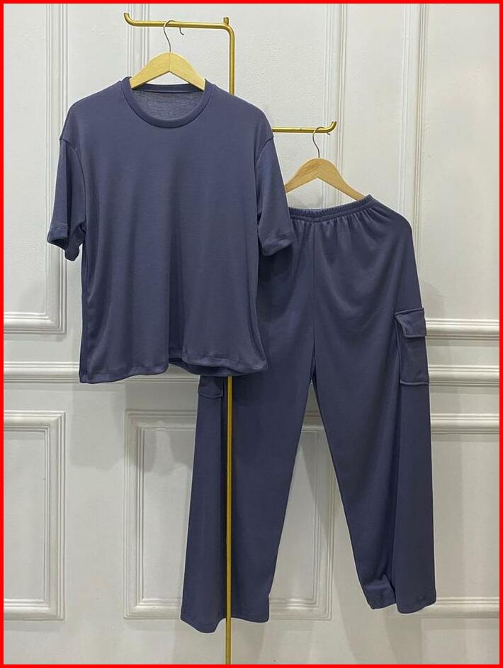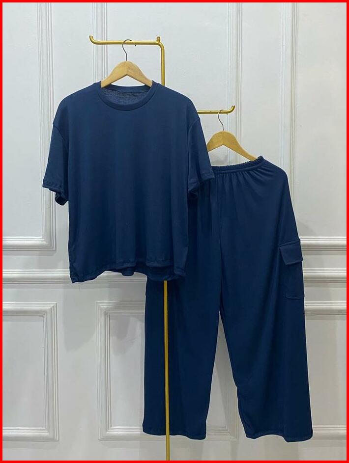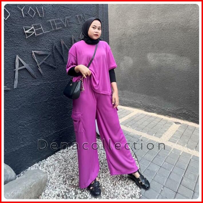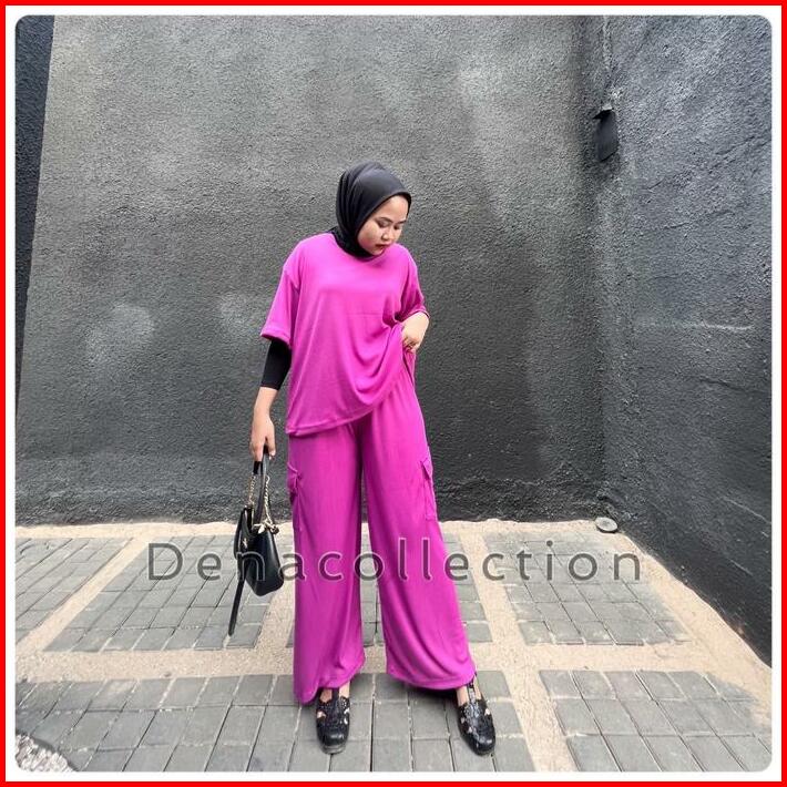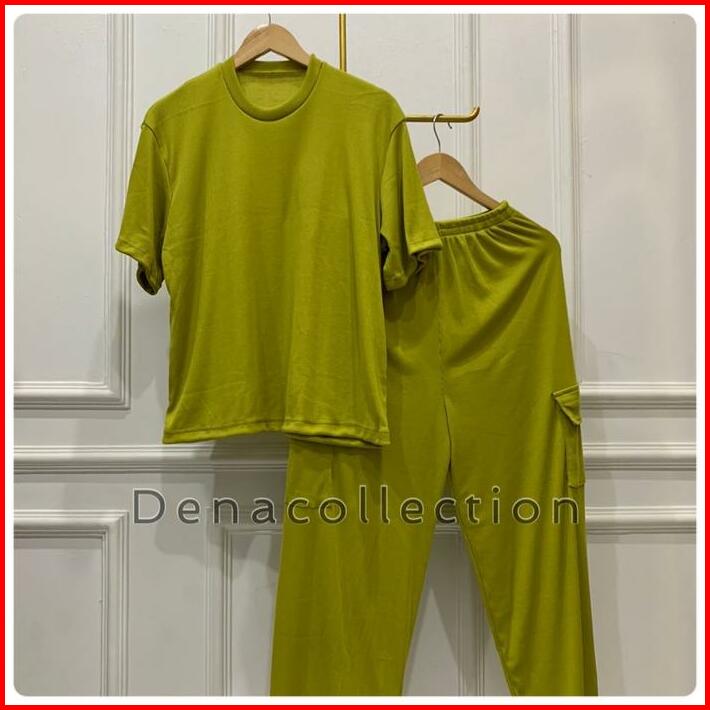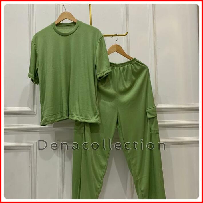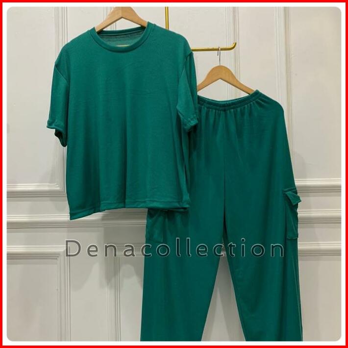 Elzie Setelan Celana Cargo Wanita Rib Knit Santai Kulot Panjang Atasan Pendek Karet Baju Dewasa