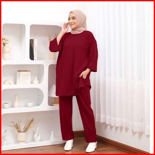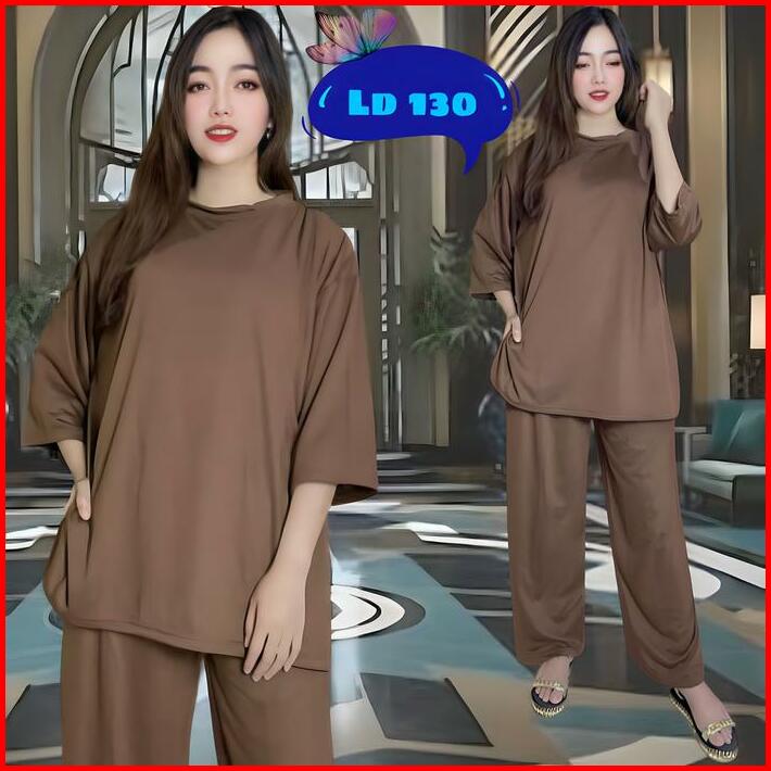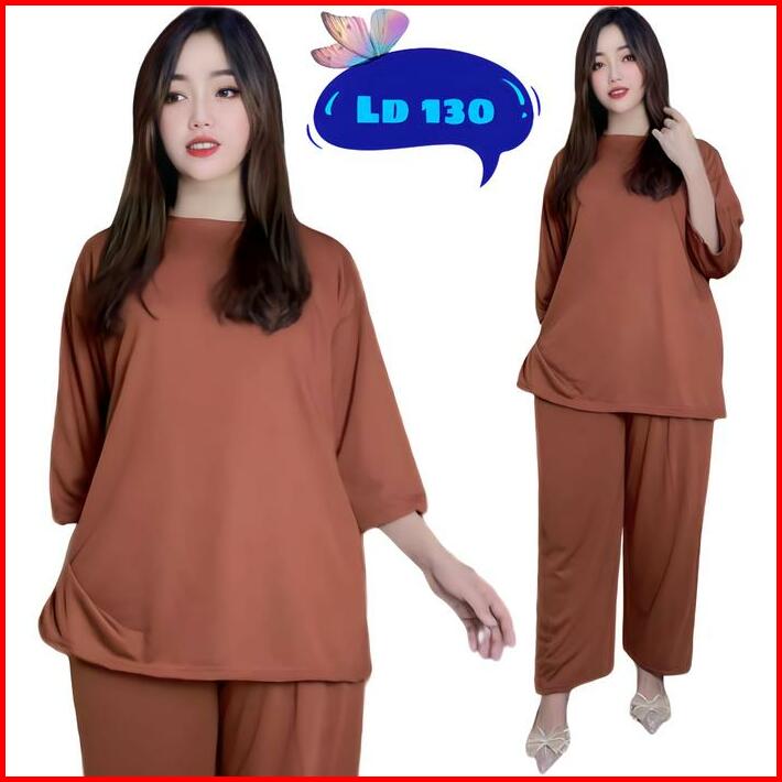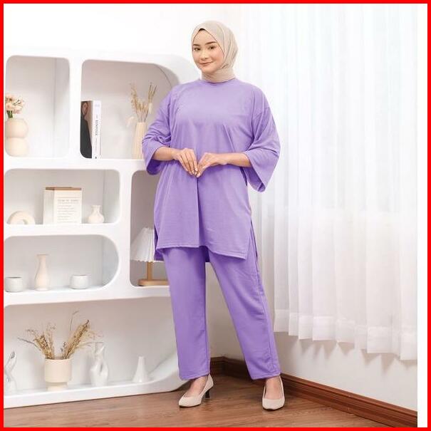 2uk Oneset Polos Jumbo Celana Atasan Oversize Basic Rata Baju Karet Wanita Setelan Kaos Melar Muslim