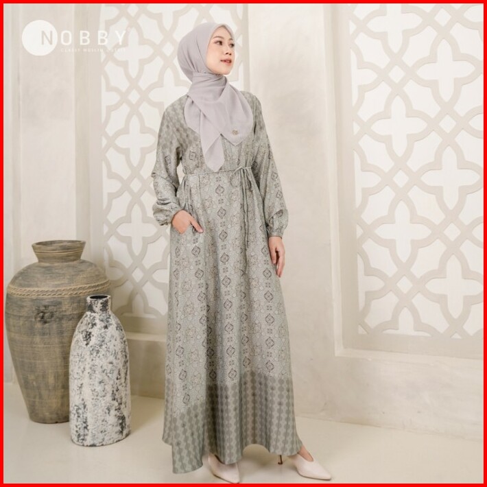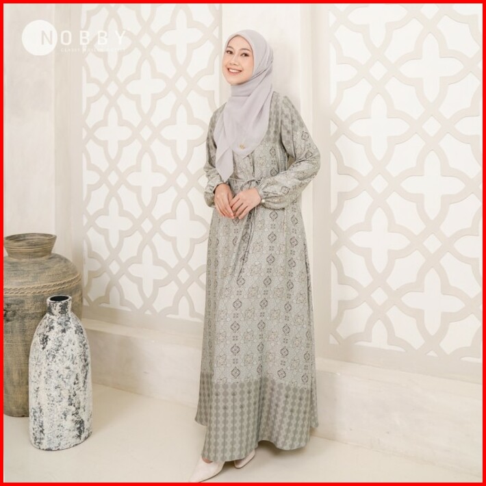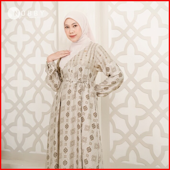 Nobby Dress Gamis Wanita Terbaru Motif Print Ukuran S-xl Busui Wudhu Friendly Bahan Satin Silk Nandini Dress