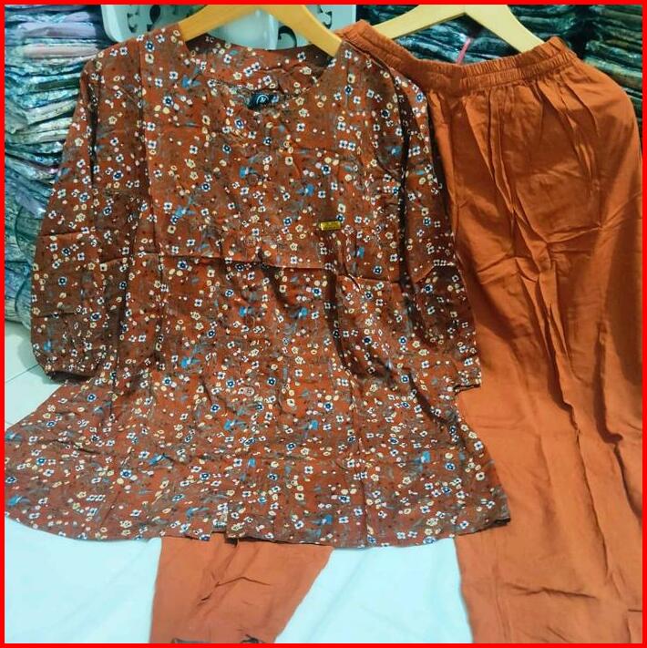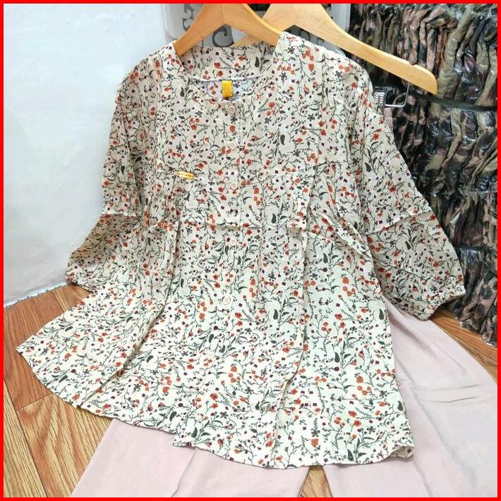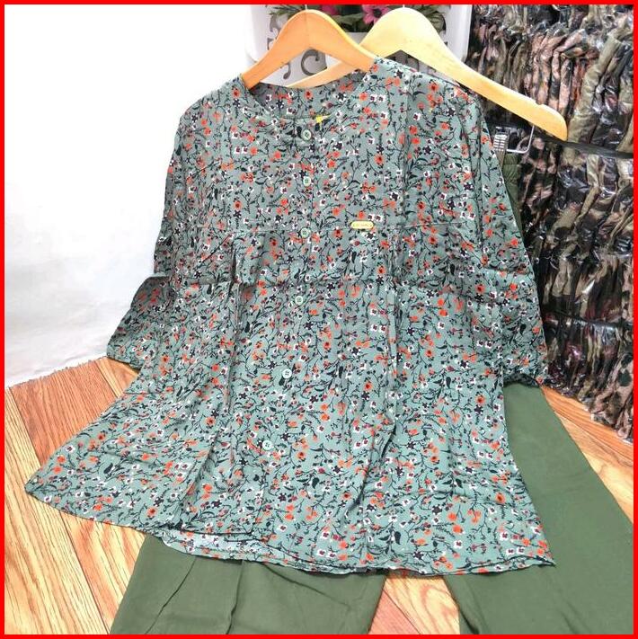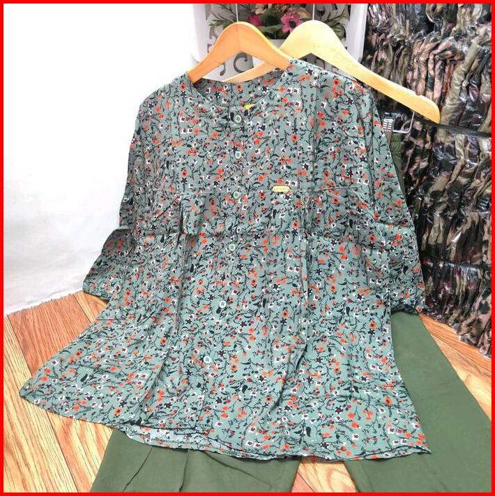 Setelan Wanita Jumbo Baju One Set Katun Rayon Nyaman Dipakai Motif Kombinasi Bunga Baju Kancing Lengan Karet Serut Kerut