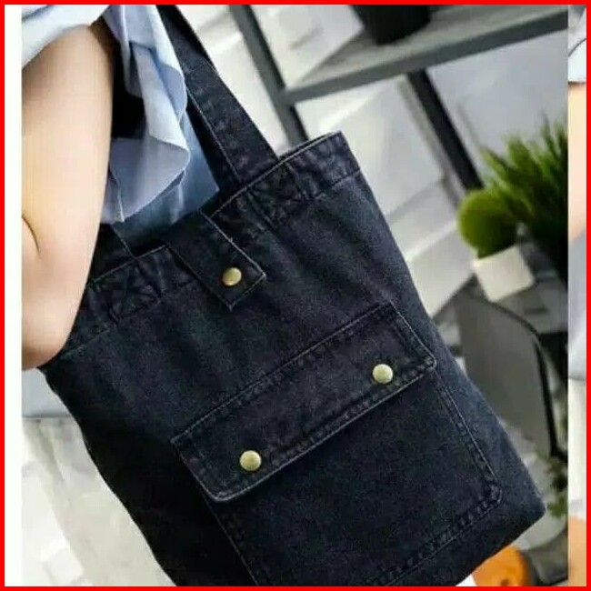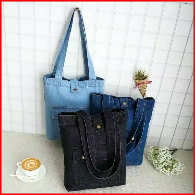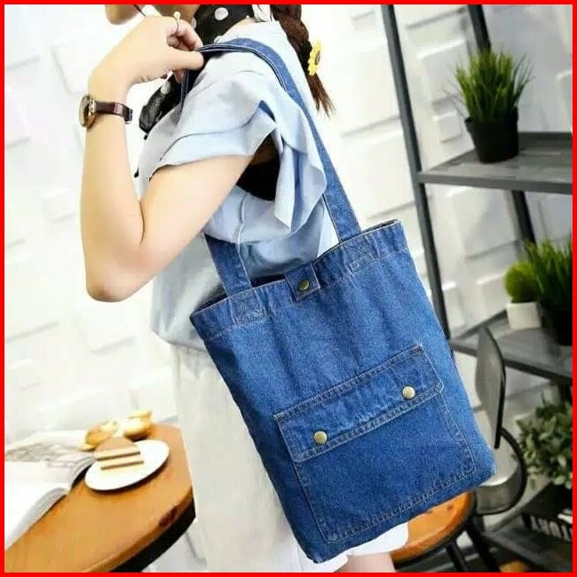 Tote Bag Wanita Monolog Pocket Denim Tas Bahu Jinjing Wanita