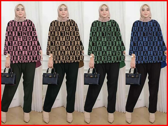 Setelan One Set Wanita Cewek Bahan Crepe Celana Hitam Oversize Motif