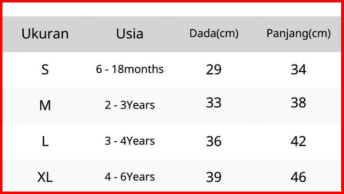 S (6 - 18MONTHS), M (2 - 3YEARS), L (3 - 4YEARS), XL (4 - 6YEARS)