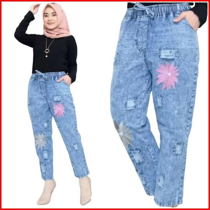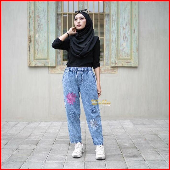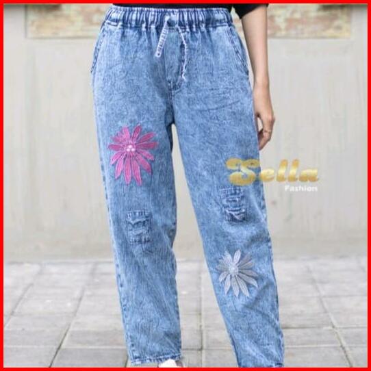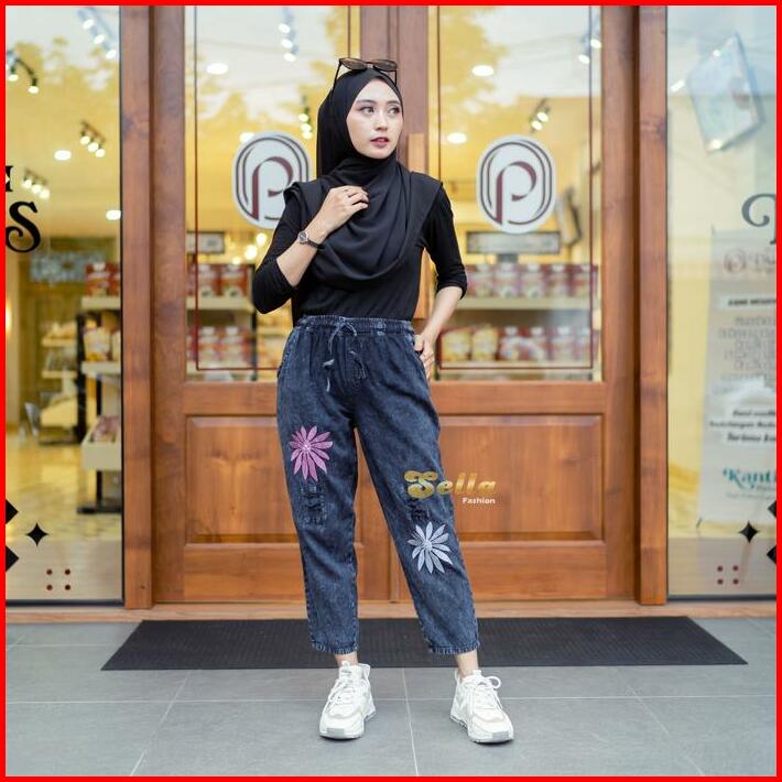 Sella Bunga Jeans Celana Wanita Terbaru 2024 Bordir Kantong Baggy Karet