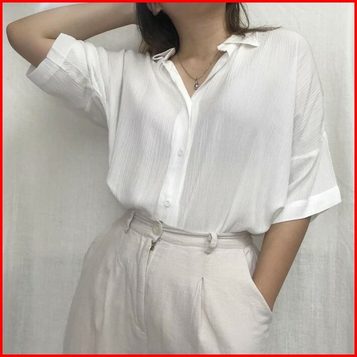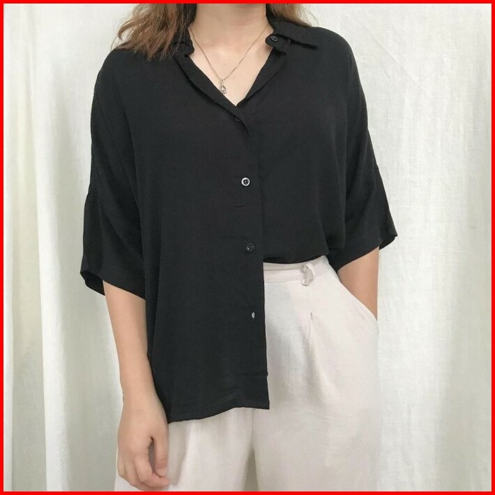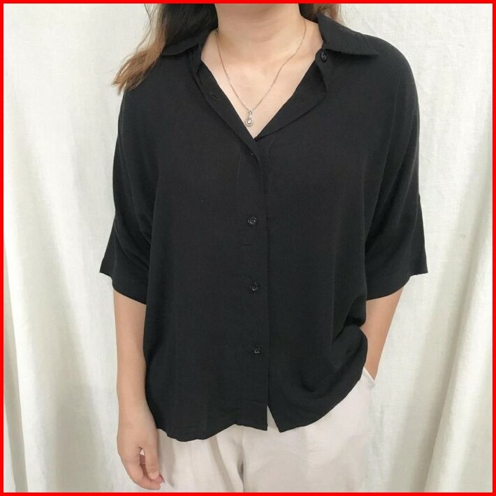 Baju Kemeja Atasan Hem Blouse Airflow Crinkle Kerah V Neck Kuliah Hitam Lengan 3 4 Ootd Polos Basic Kantor Kerja Perempu