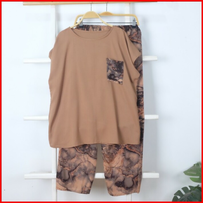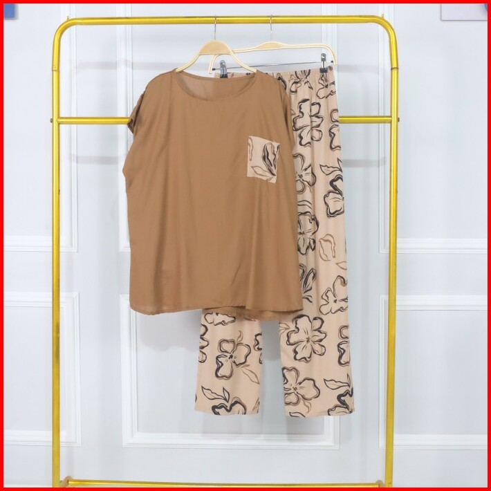 Setelan Piyama Wanita Babydoll Rayon Motif Lengan Pendek Jumbo Ld112cm