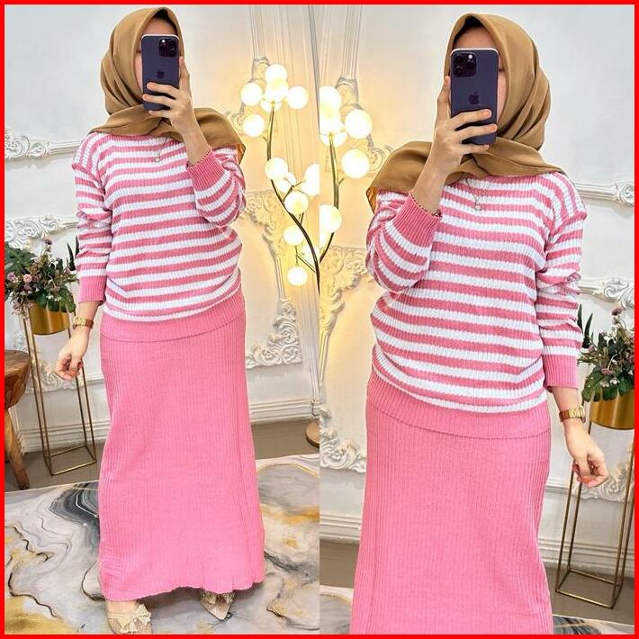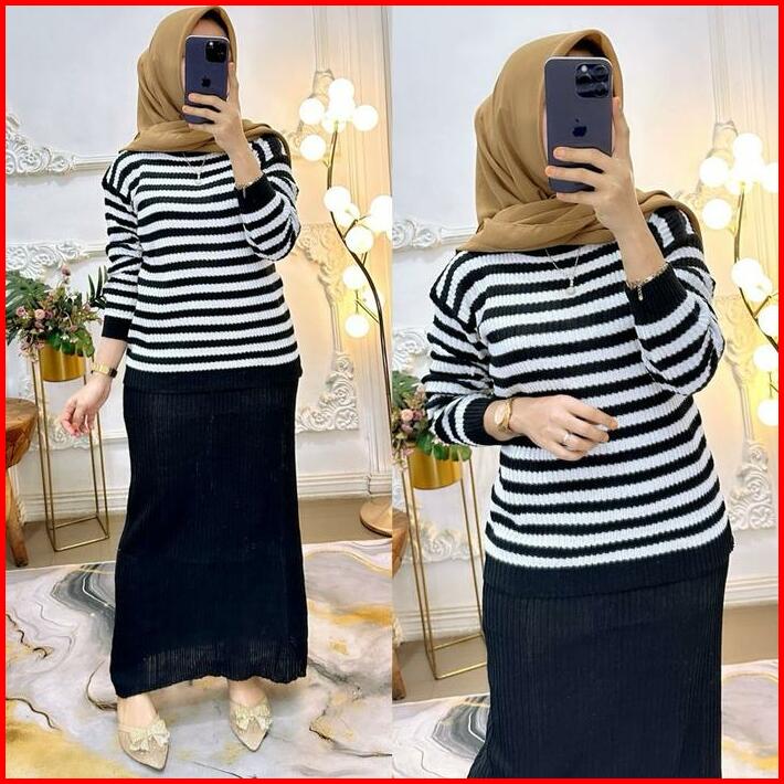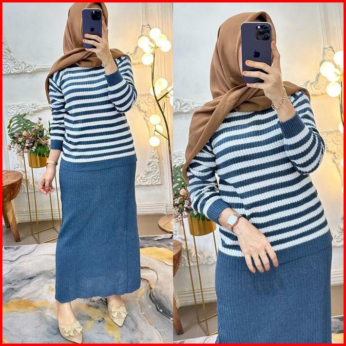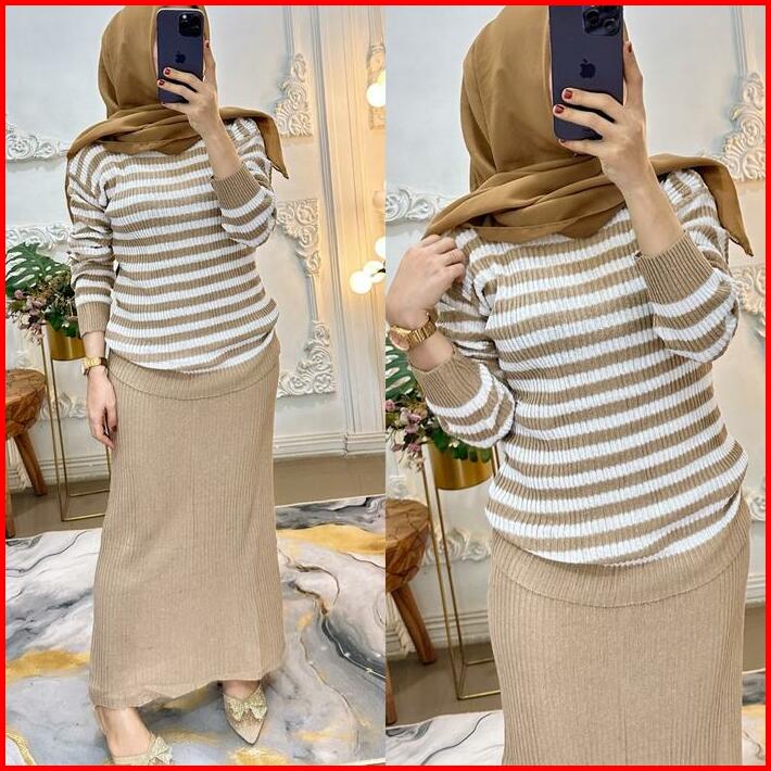 Setelan Rok Rajut Garis Lengan Panjang Bestseller Tebal Adem Tidak Nerawang Muslim Wanita