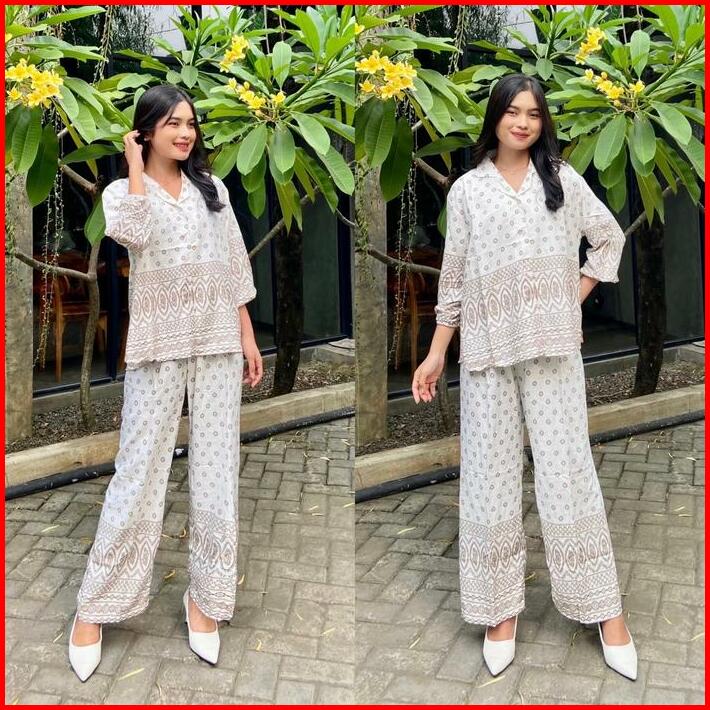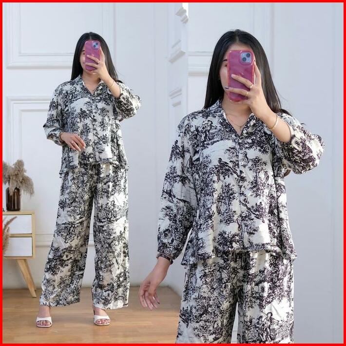 Setelan Wanita Kemeja Celana Bahan Rayon One Set Wanita Panjang Ld 120 Motif Atasan Karet Nyaman