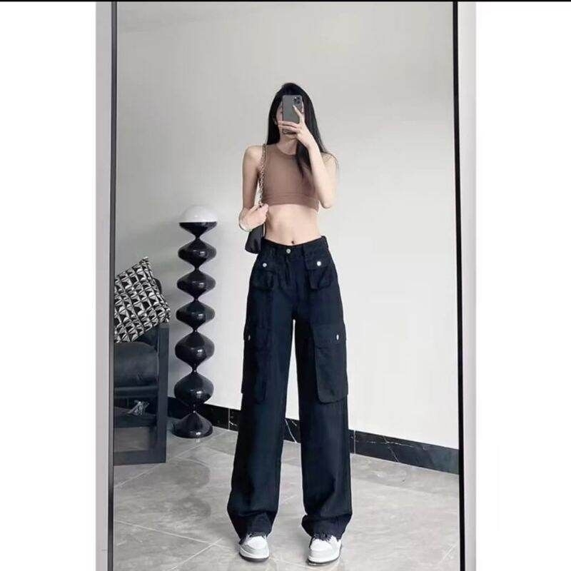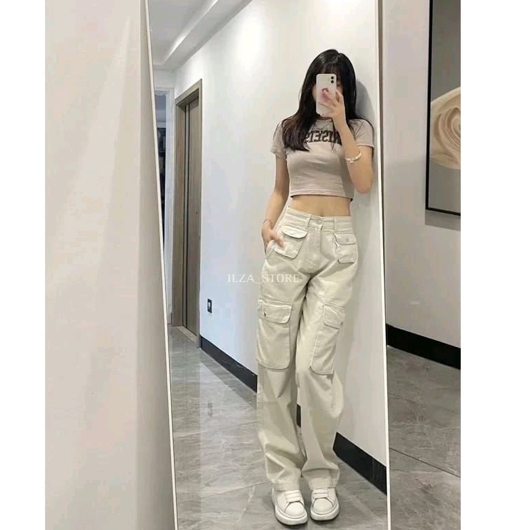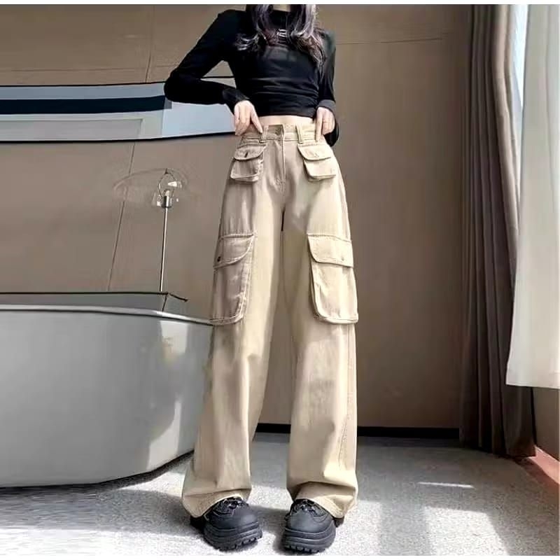 Celana Cargo Wanita Loose Jeans Pasir Putih Highwaist Korea