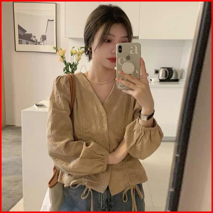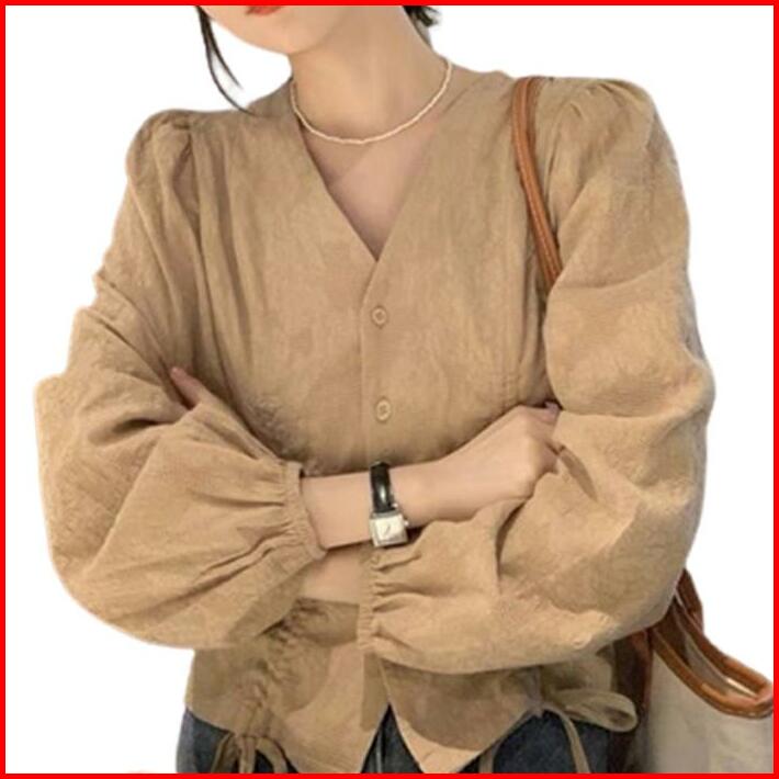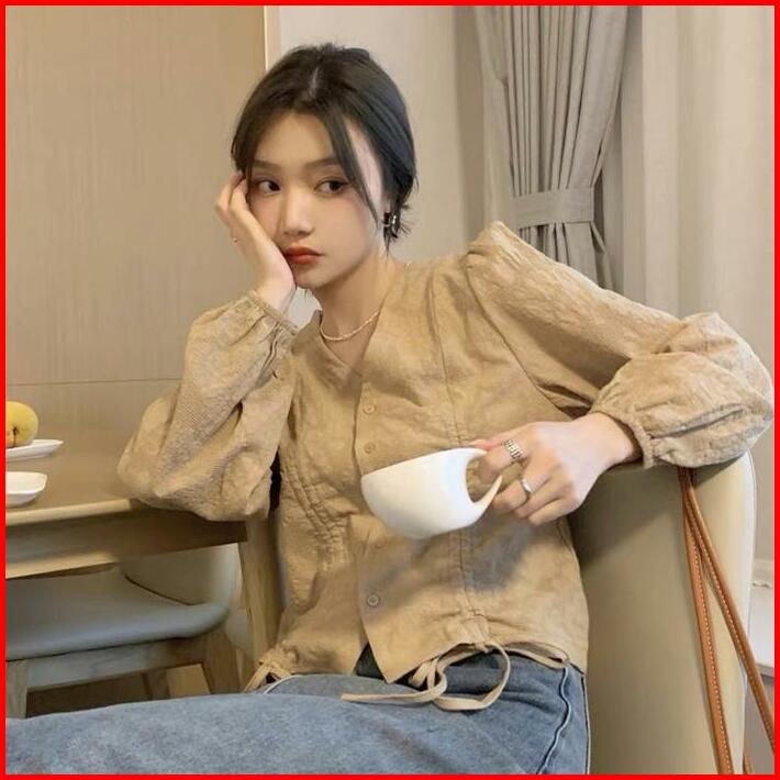 Atasan Lengan Panjang Wanita Lengan Balon Serut Tali Kemeja Katun Baju Bunga Muda Motif