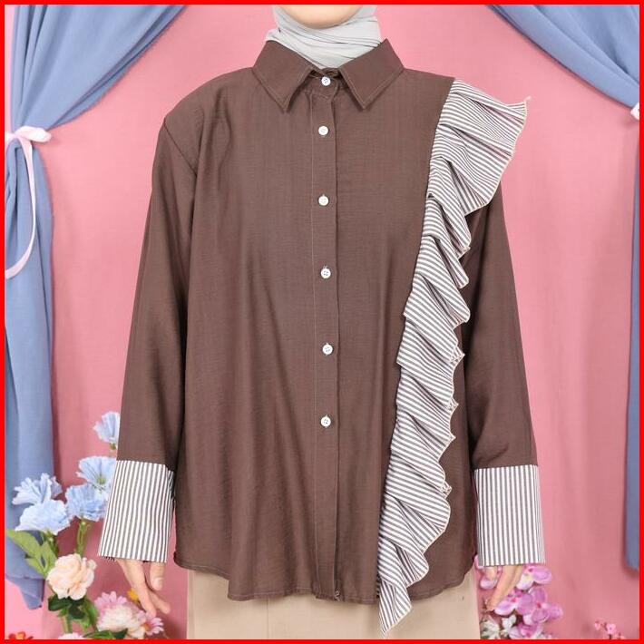 Mybamus X Mangzilasf Lavia Kemeja Ruffle Kemeja Wanita Atasan Kekinian Outfit Kerja Baju Kancing Muslim Panjang Remaja D