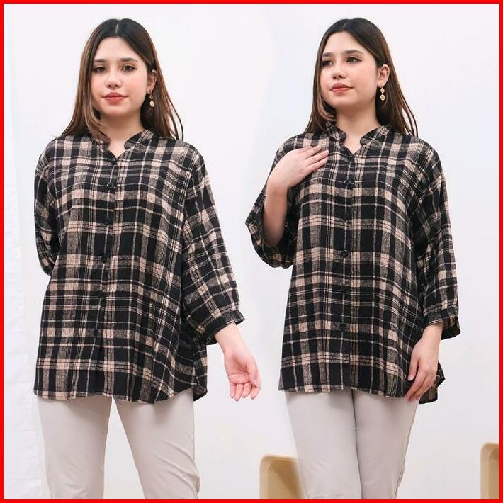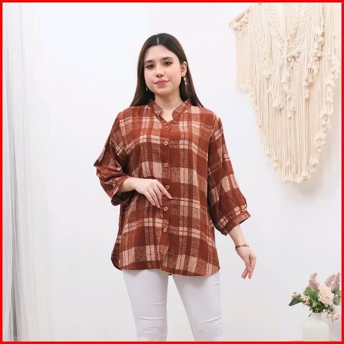Kemeja Blouse Wanita Kancing 3 Full Kancing Bahan Rayon Kotak Premium Baju Wanita