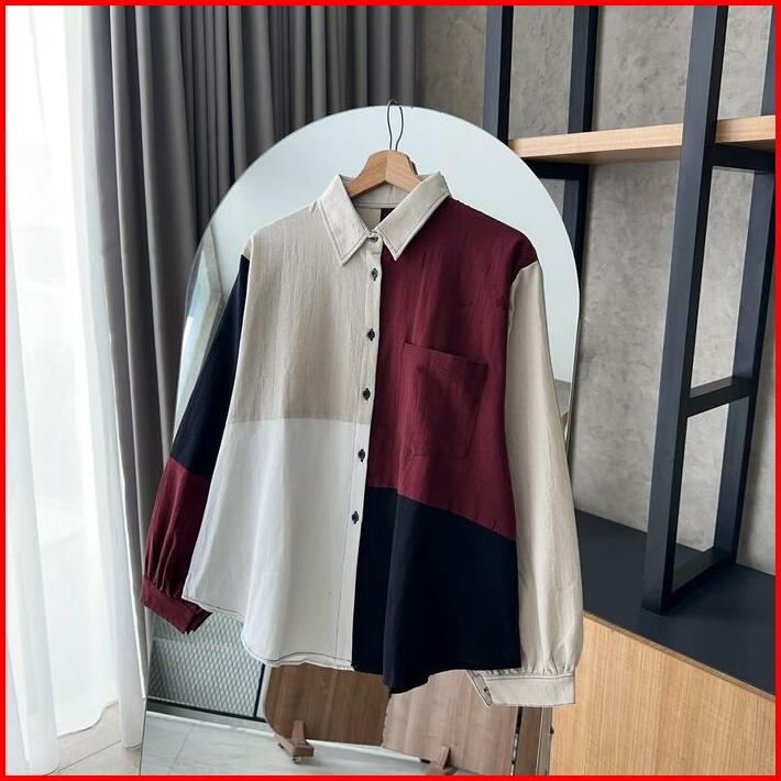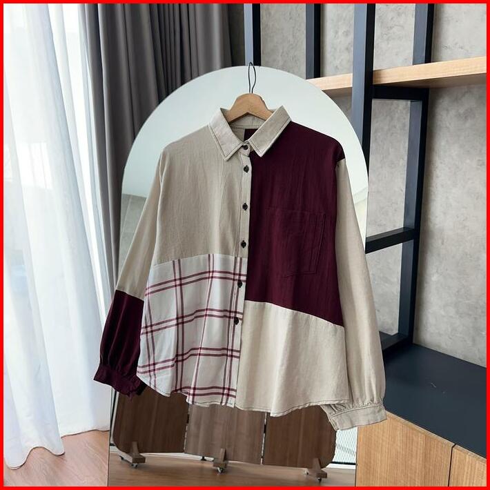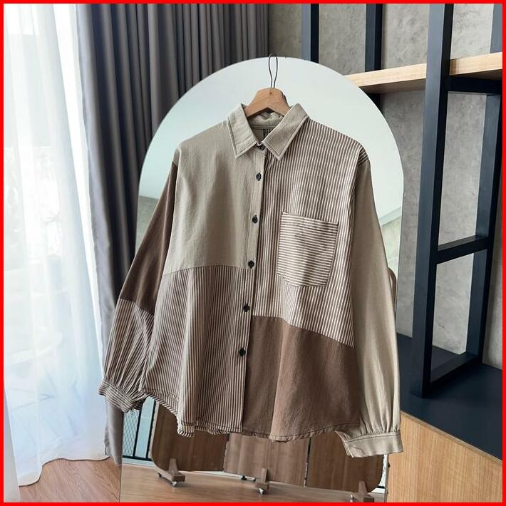 By.hana 687 Kemeja Oversize Linen Motif Kombinasi Atasan Wanita Variasi Baju Katun Panjang
