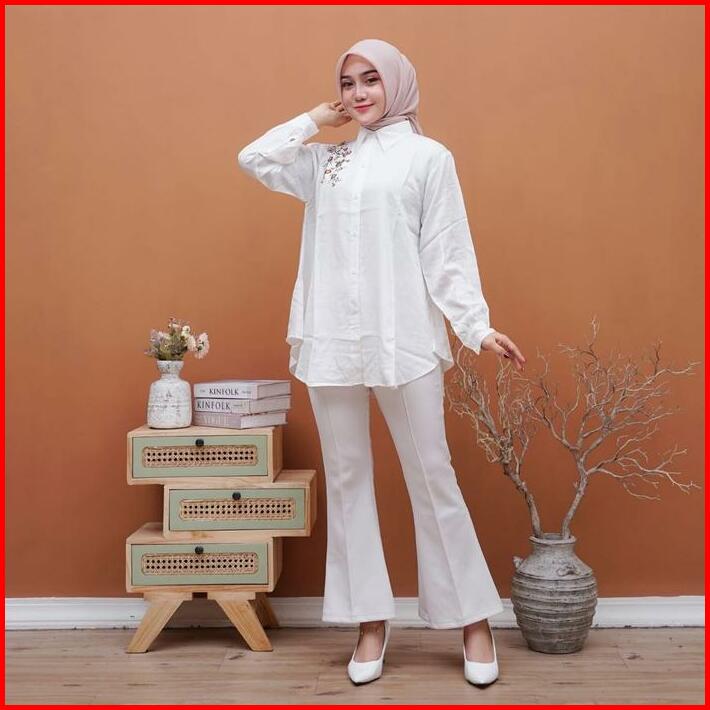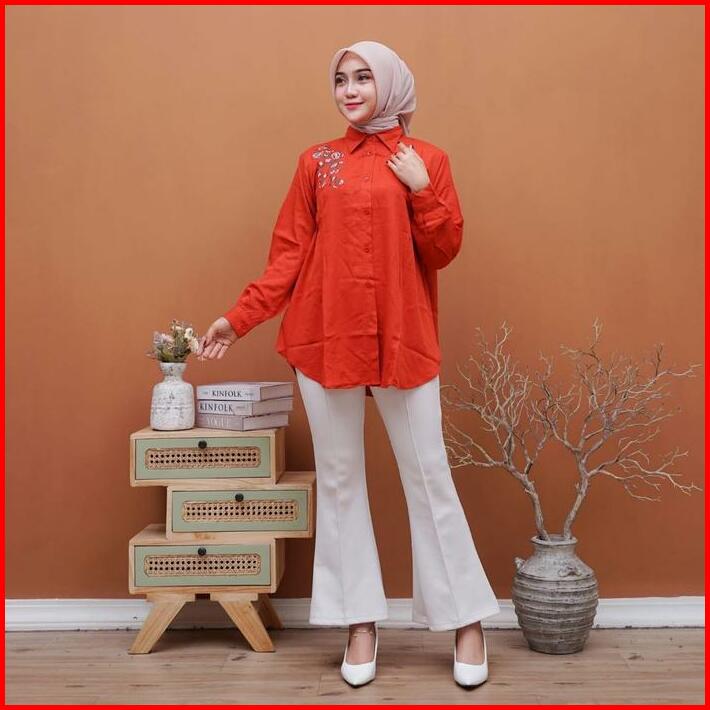 Kinaya Blouse Bordir Rayon Twill Premium Atasan Wanita Dewasa Casual Cantik Muslim Kancing Nyaman Santai Garis Panjang W