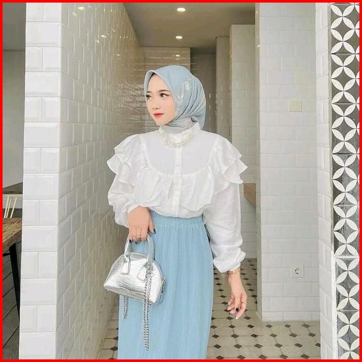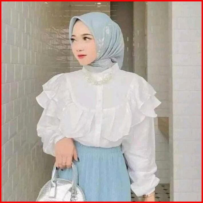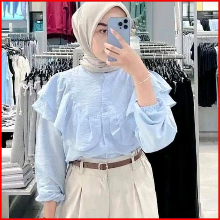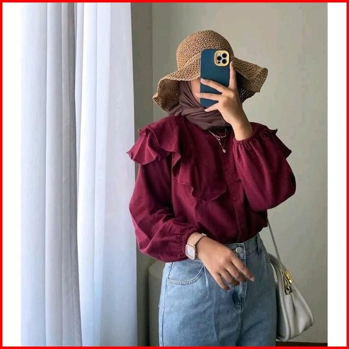 Rafella Blouse Ruffle Kain Polo Linen-atasan Kemeja Wanita 2025 Kerah Sanghai Baju Kancing Panjang Tangan Variasi Casual