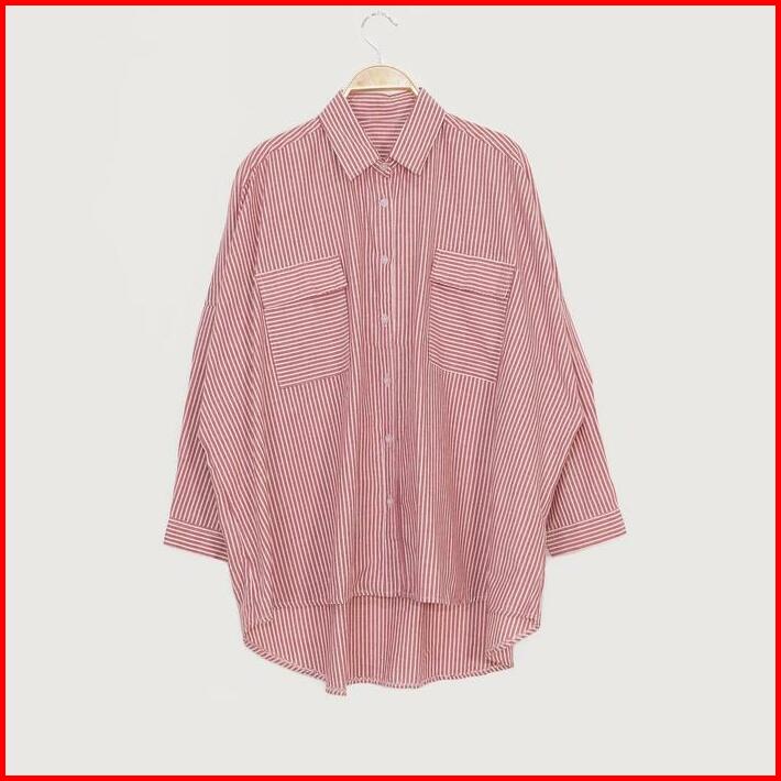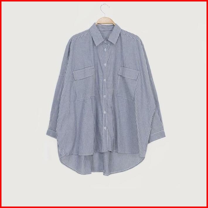 Kara.id Pocket Salur Kemeja Oversized Pakaian Wanita Stripe Shirt Atasan Wanita Lengan Panjang Fit Katun