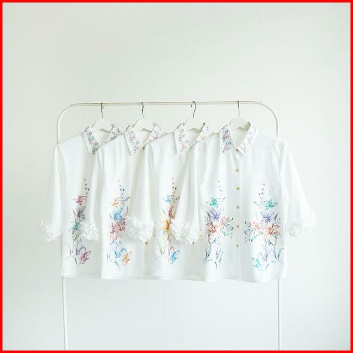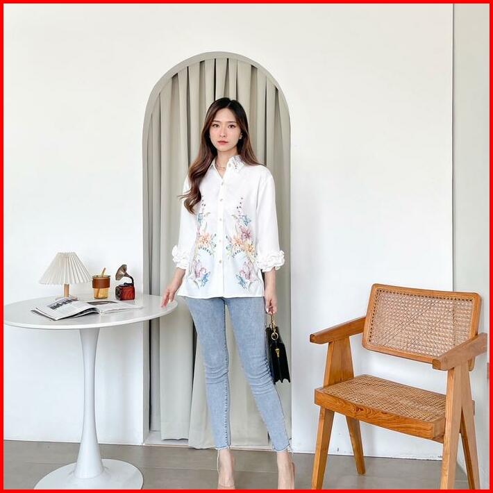 Joana Kemeja Printing Wanita Motif Bunga Tangan Ruffle