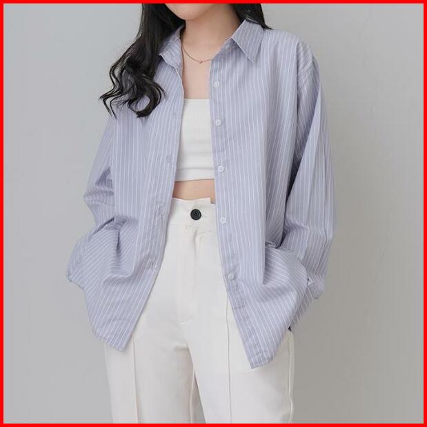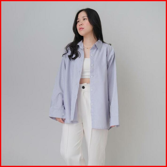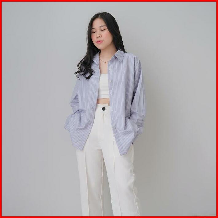 Flowing Stripes Editions Kemeja Basic Salur Wanita Lengan Panjang Kemeja Kerja Kantor Aesthetic
