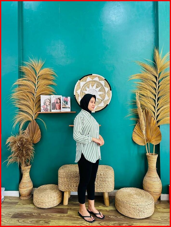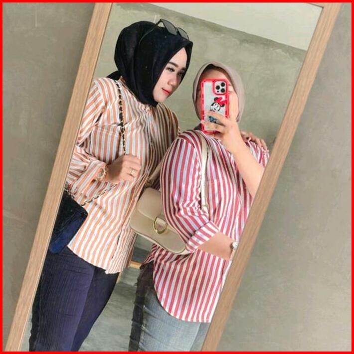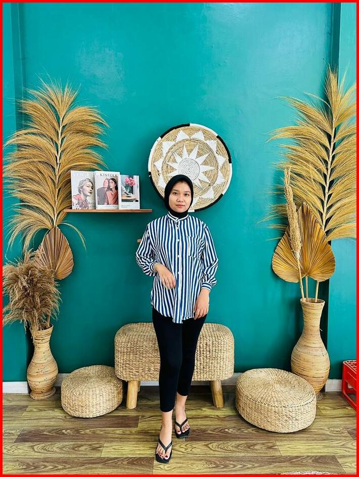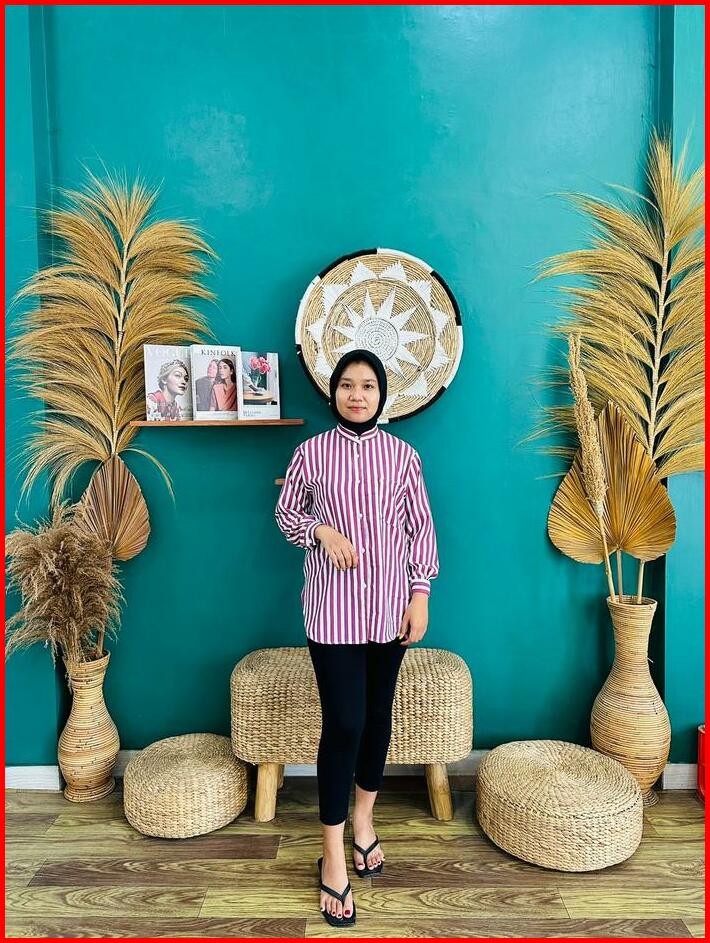 Kemeja Crinkle Motif Salur Airflow Katun Samping Wanita Atasan Panjang Garis Oversize Garis Oversize Stripe Baju