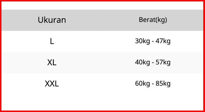 L ( BB 30KG - 47KG ), XL ( BB 40KG - 57KG ), XXL ( BB 60KG - 85KG )
