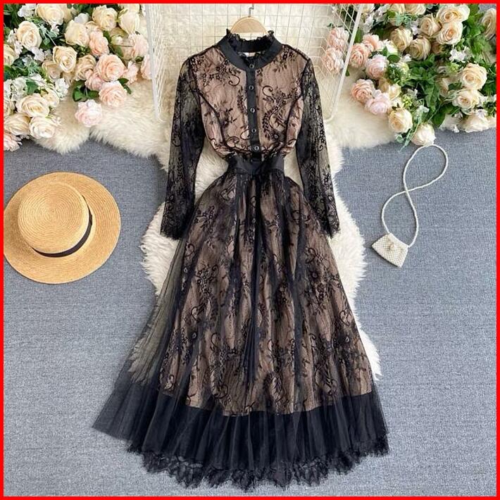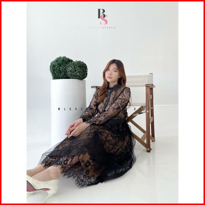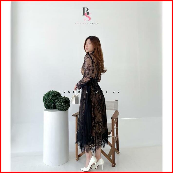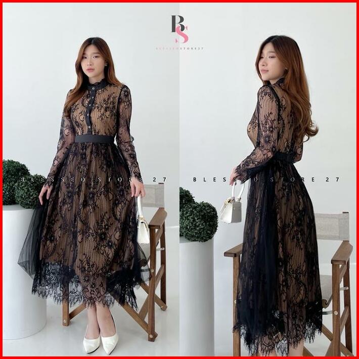 D0915 Rebecca Korean Style Tile Vintage Maxi Dress Black Pesta Kondangan Mewah Brocade Brukat Lace Natal Pesta