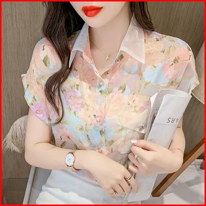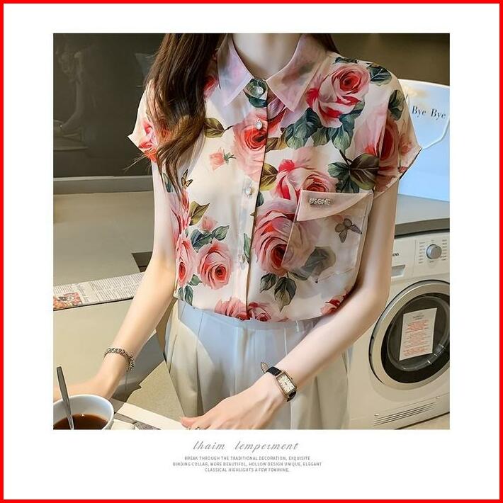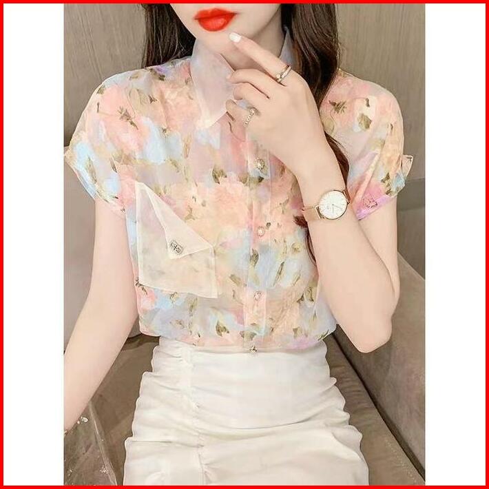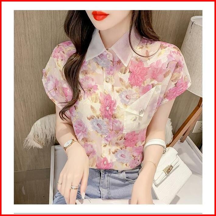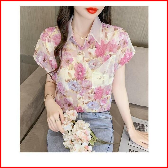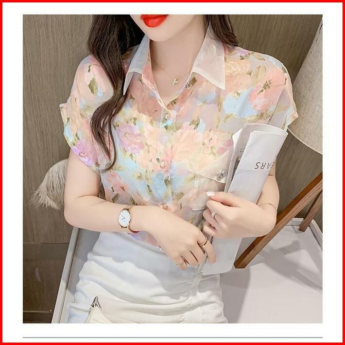 W328 Kemeja Lengan Pendek Berkerah Kemeja Sifon Motif Floral Bunga Kemeja Wanita Gaya Korea