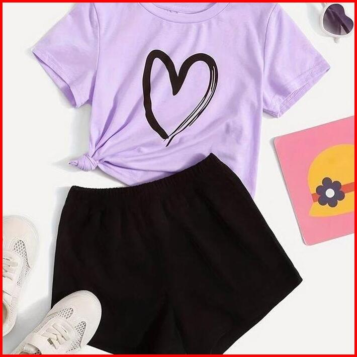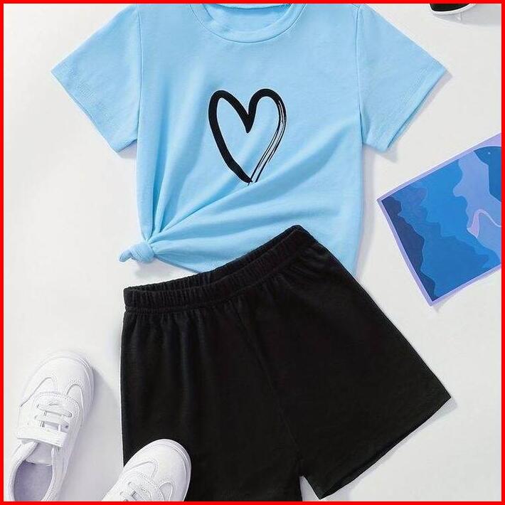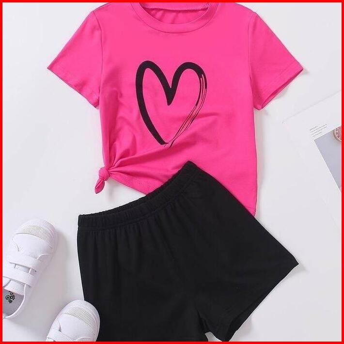 Setelan Anak Cewe Motif Love Model Baju Pendek Dan Celana Pendek Untuk Anak Usia 1-10 Tahun Perempuan Katun Cewek Bayi P