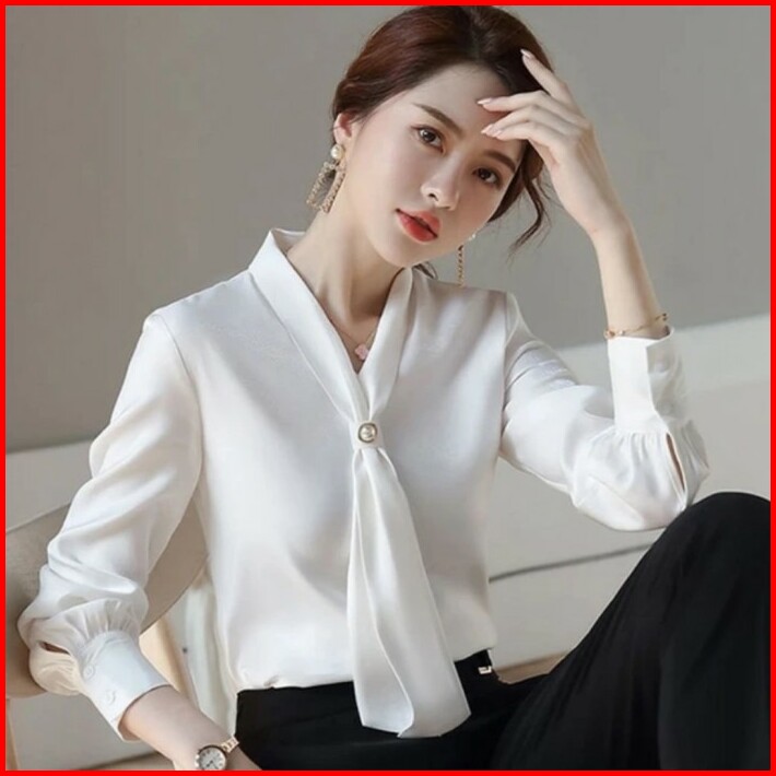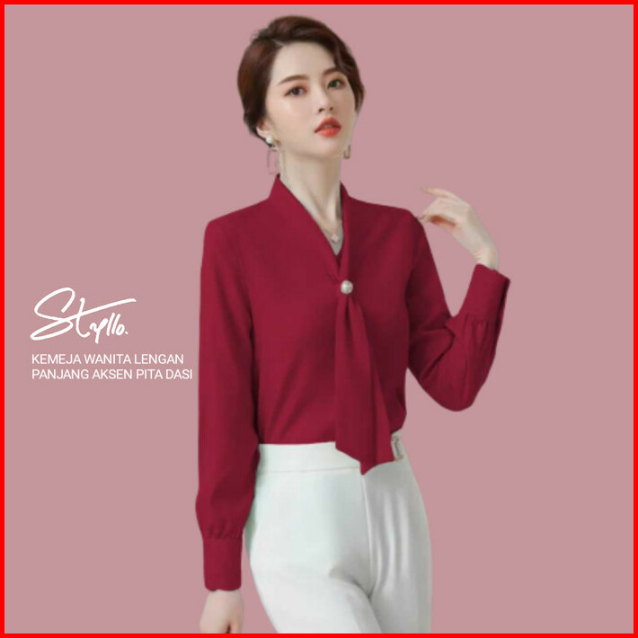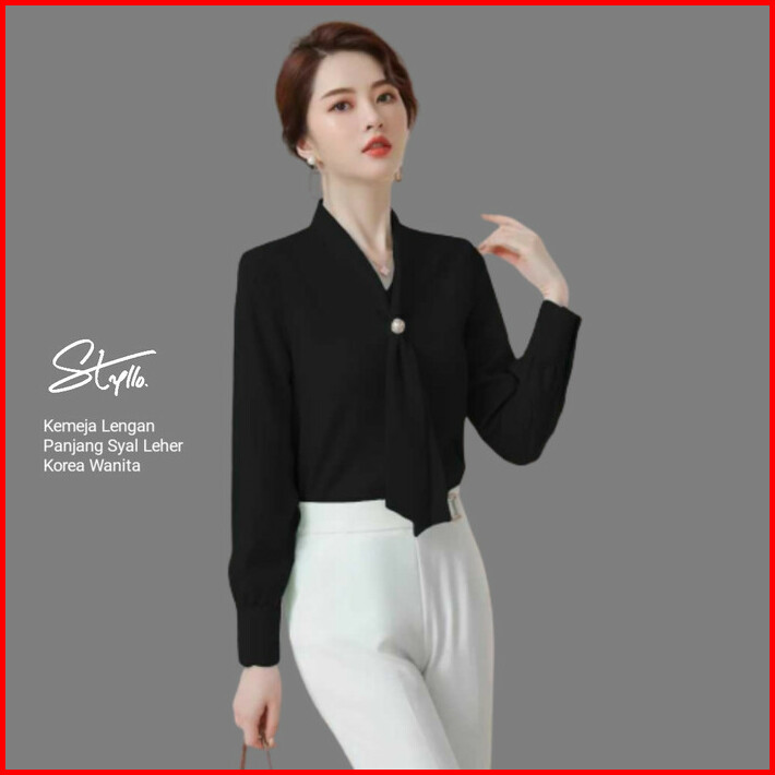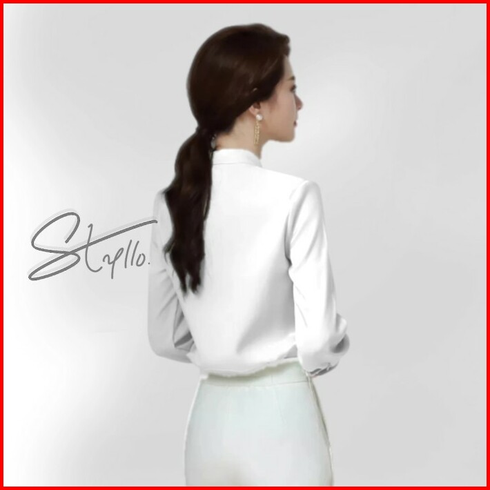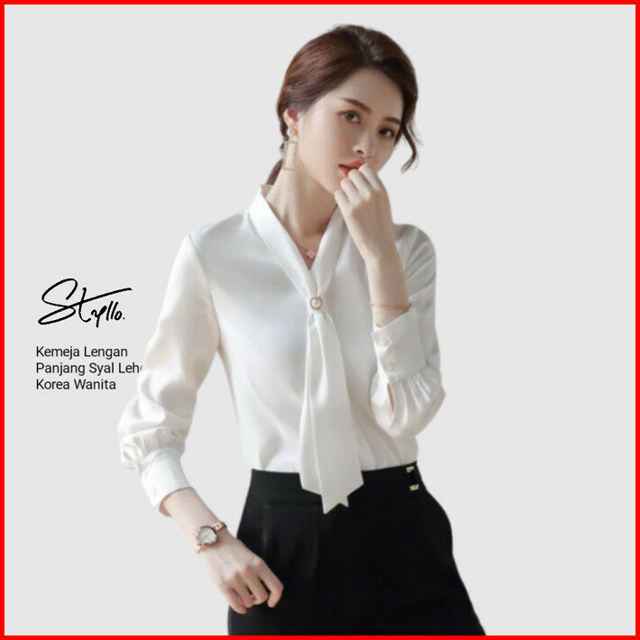 Kemeja Lengan Panjang Wanita Syal Leher Korean Basic White Putih