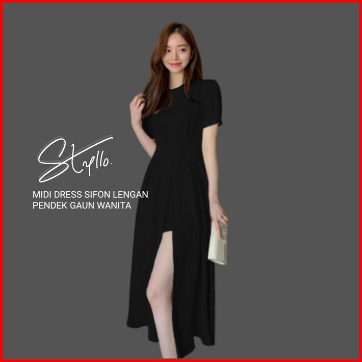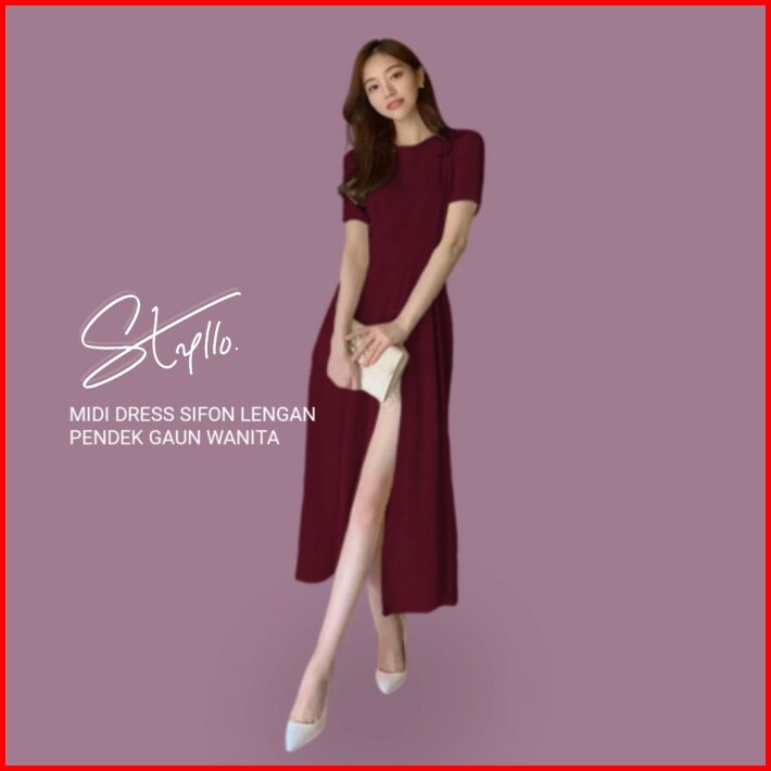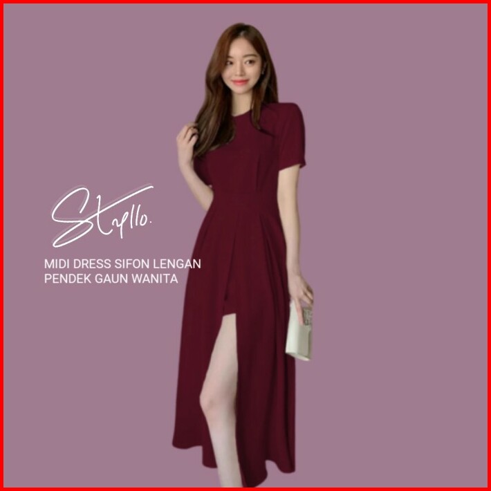 Midi Dress Lengan Pendek Gaun Korea Wanita Layered Sifon Anggun Maroon