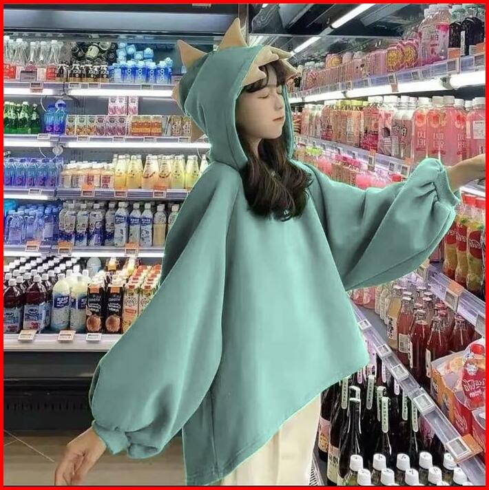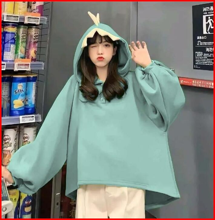 Dinos Hoodie Sweater Oversize Wanita Korean Style Bahan Fleece Polos Crewneck Basic Zipper Tebal Atasan Oblong