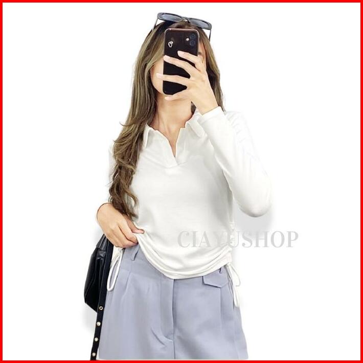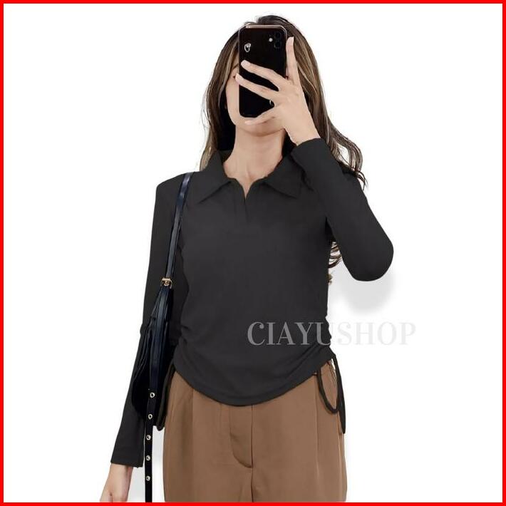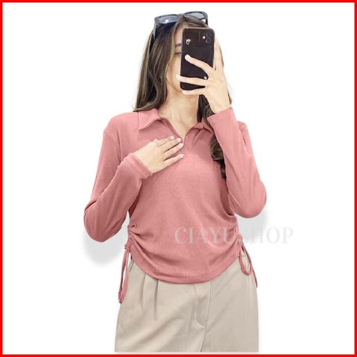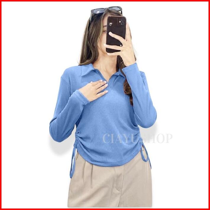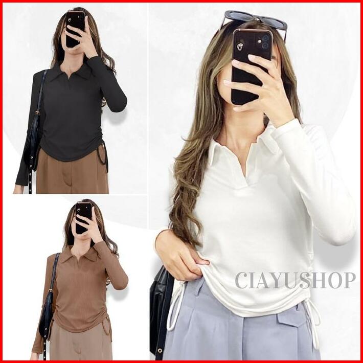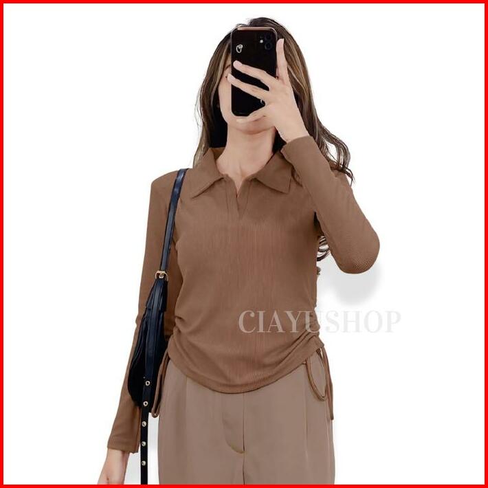 Xena Polo Top Blouse Serut Samping Kaos Rib Knit Valerie Modern Casual Strechy Atasan Wanita Kekinian Terbaru Garis Cant