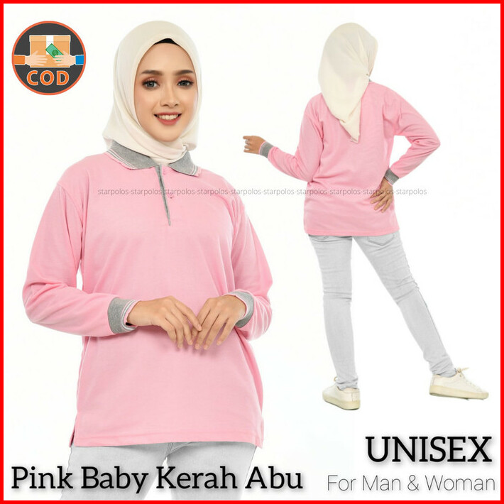 Kaos Kerah Polo Shirt Lengan Panjang Wanita Pink Kerah Abu Pink Baby