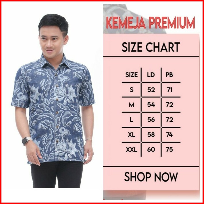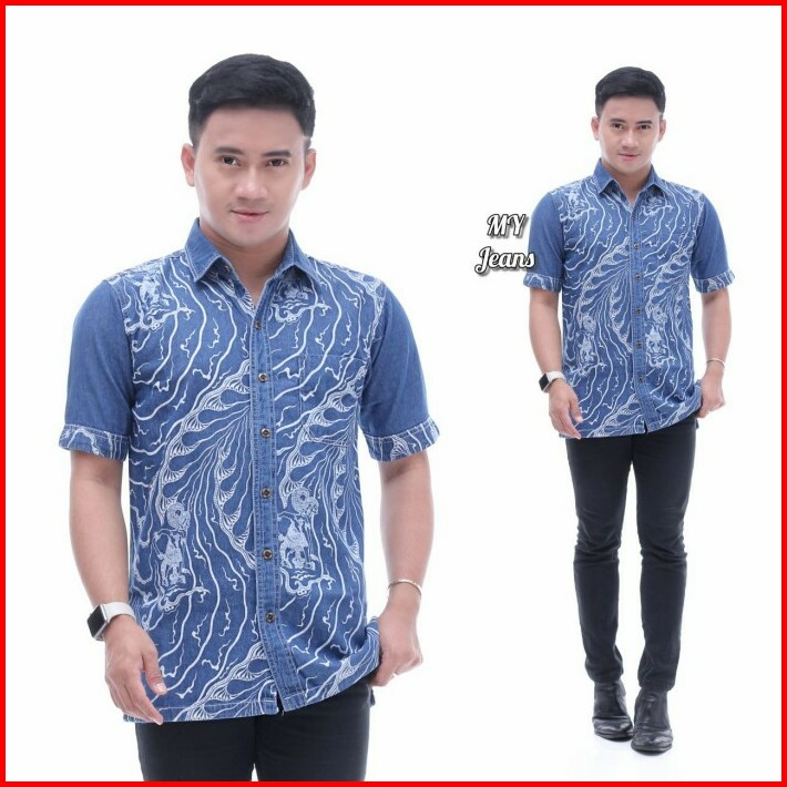 Kemeja Pria Jeans Kain Denim Batik Lengan Pendek Slimfit Bm3