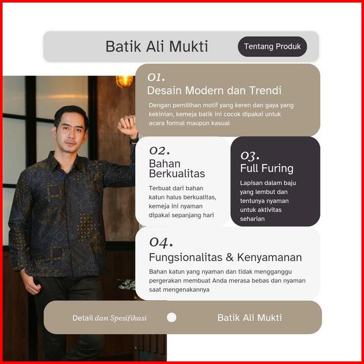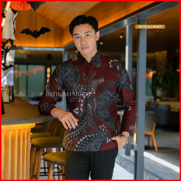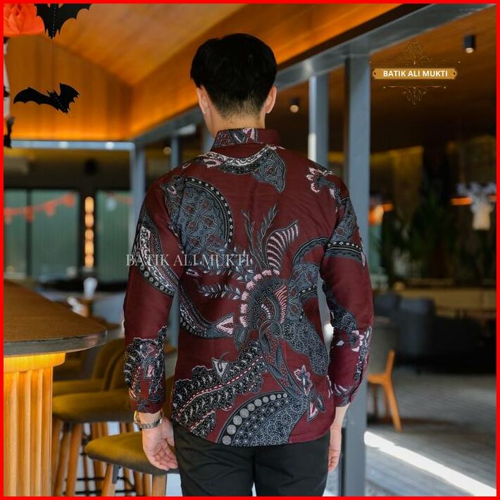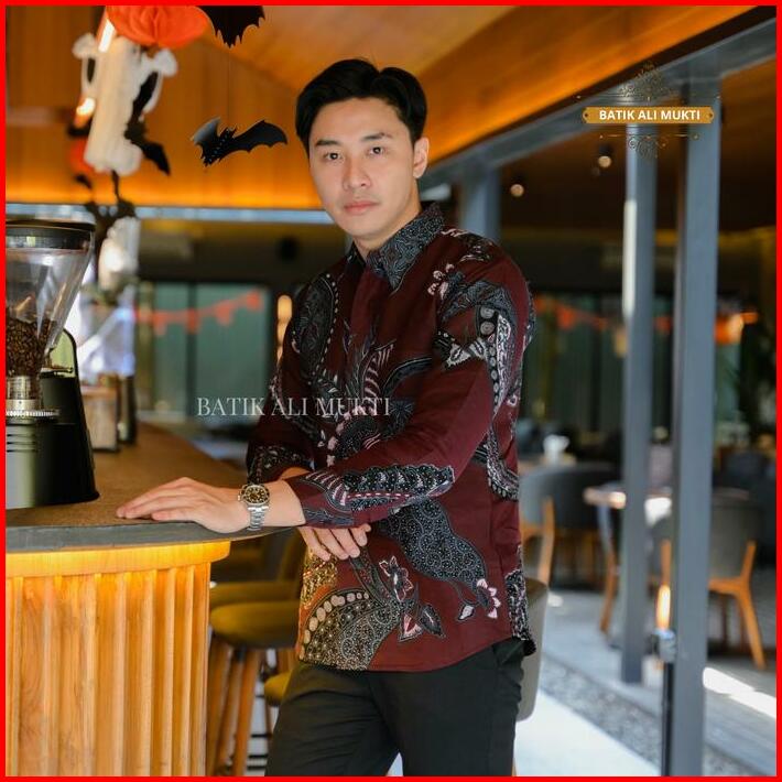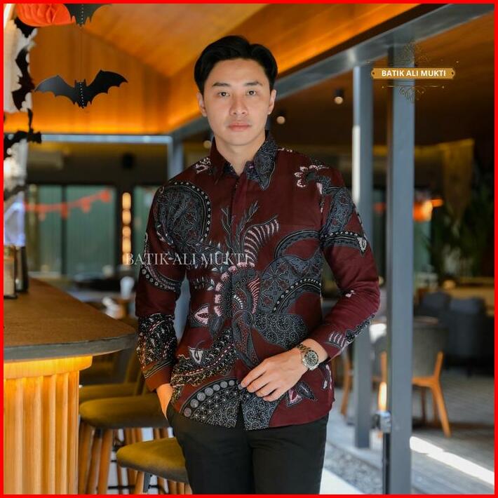 Batik Slimfit Burgundy Pria Lengan Panjang Baju Kemeja Kondangan Anak Muda Katun Halus Furing Motif Rajasakti
