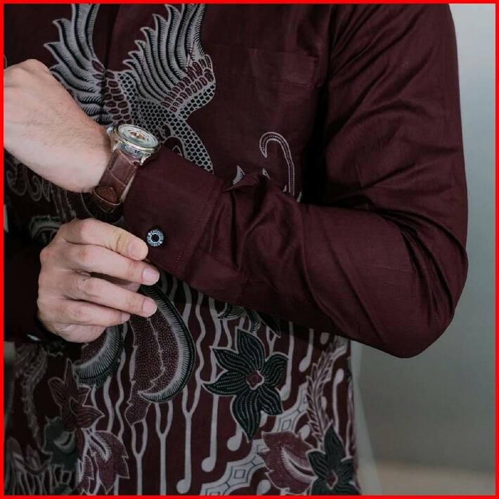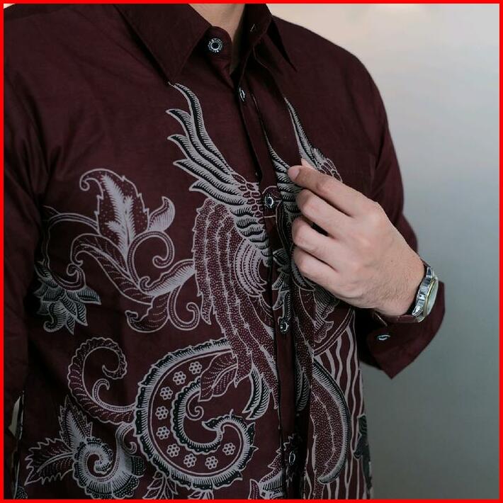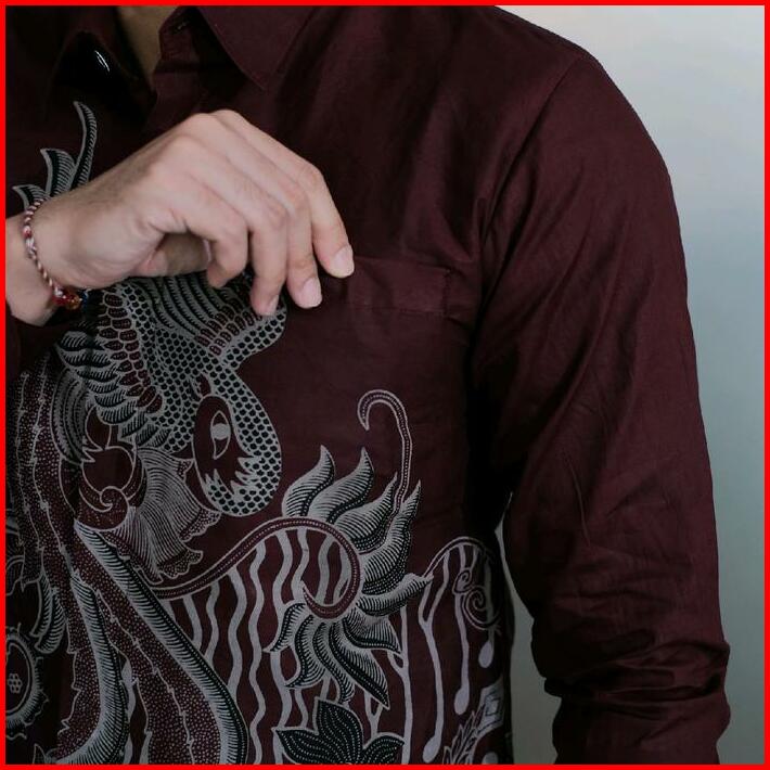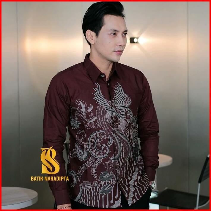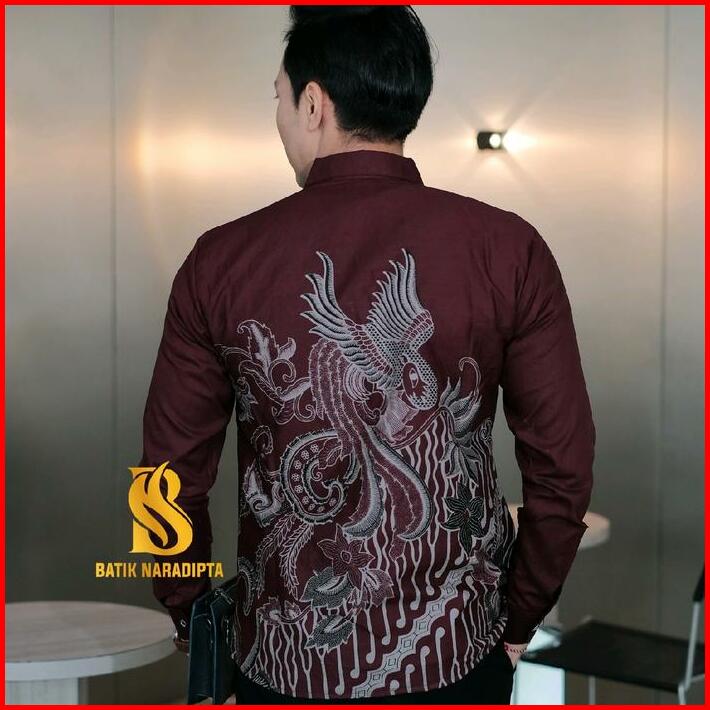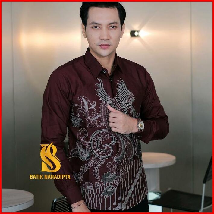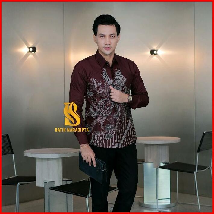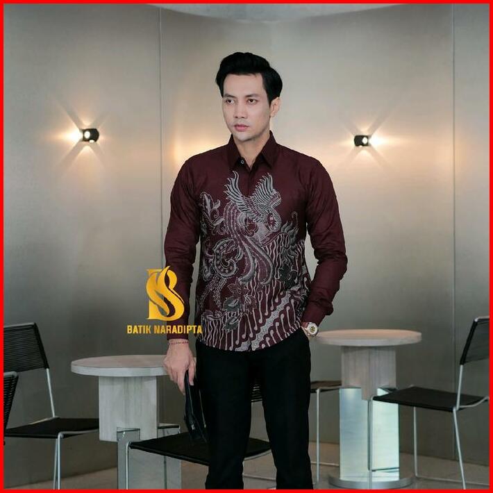 Ajisaka Burgundy Batik Naradipta Slimfit Pria Baju Motif Kemeja Lengan Panjang Pendek Dewasa Katun Prima Premium Full Fu