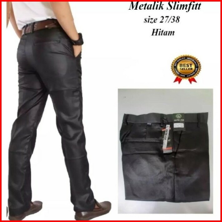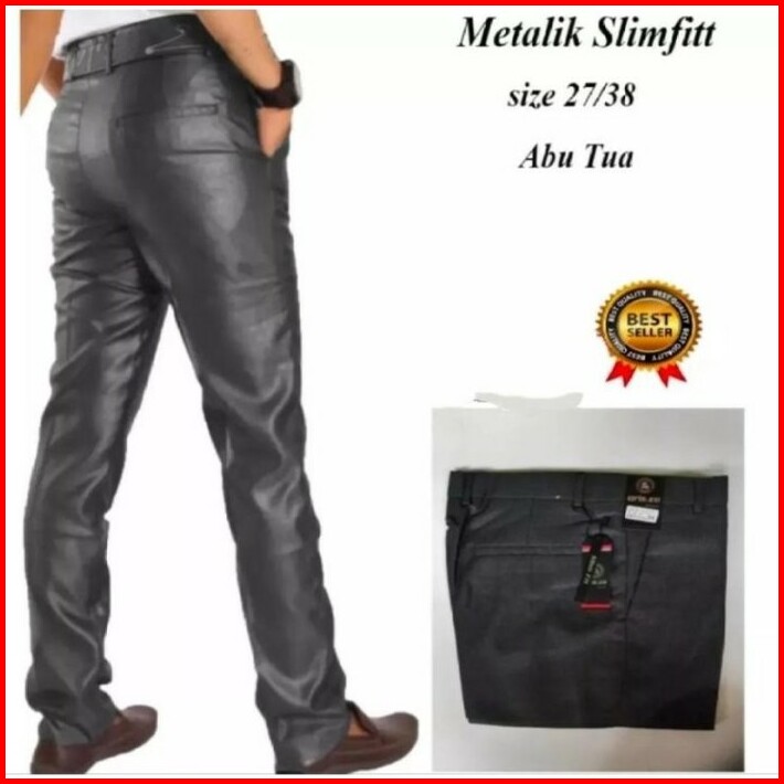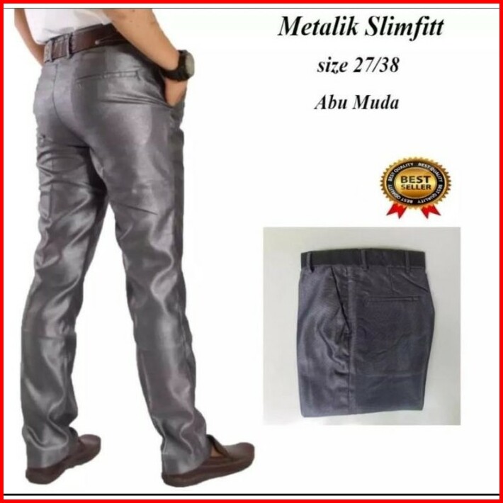 Celana Formal Pria Bahan Mengkilap Metalik Slimfit Kantor Panjang