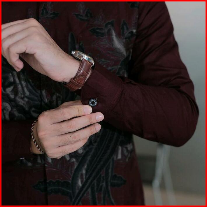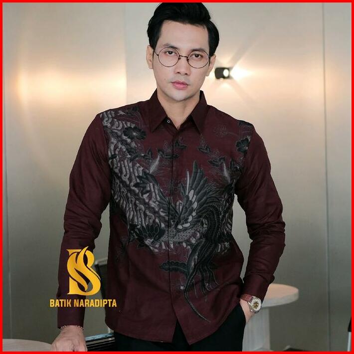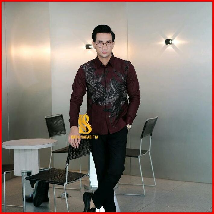 Lakeswara Burgundy Baju Motif Batik Naradipta Hem Slimfit Katun Prima Premium Kemeja Pria Kerja Dewasa Kantor Panjang Fu
