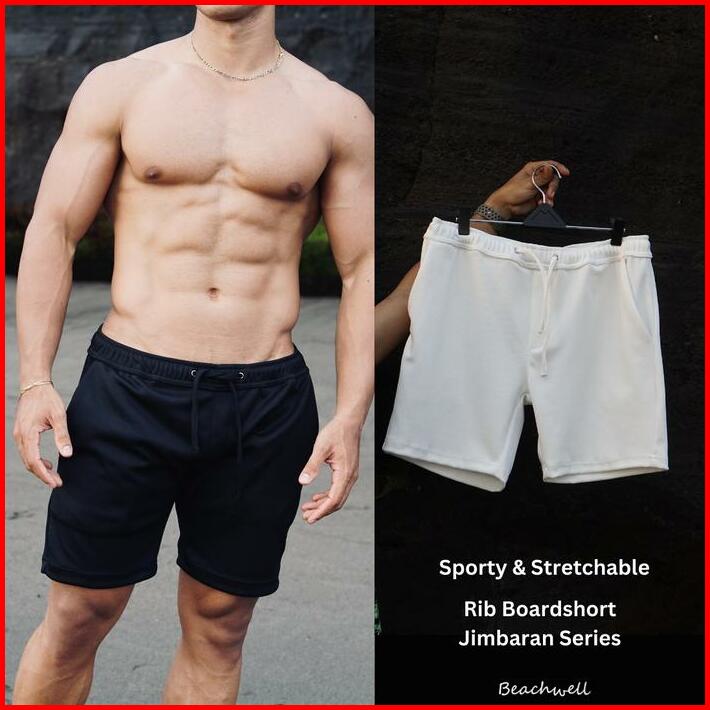 Celana Pendek Pria Rib Boardshort Garis Garis Putih Hitam Polos Series Sportwear Beachwell Bali Fit Nyaman