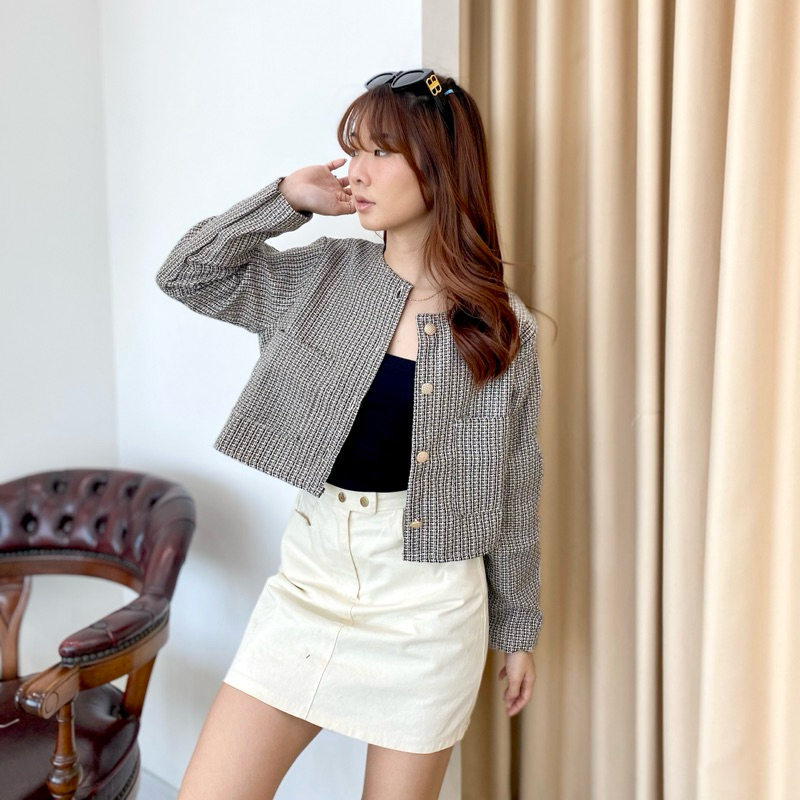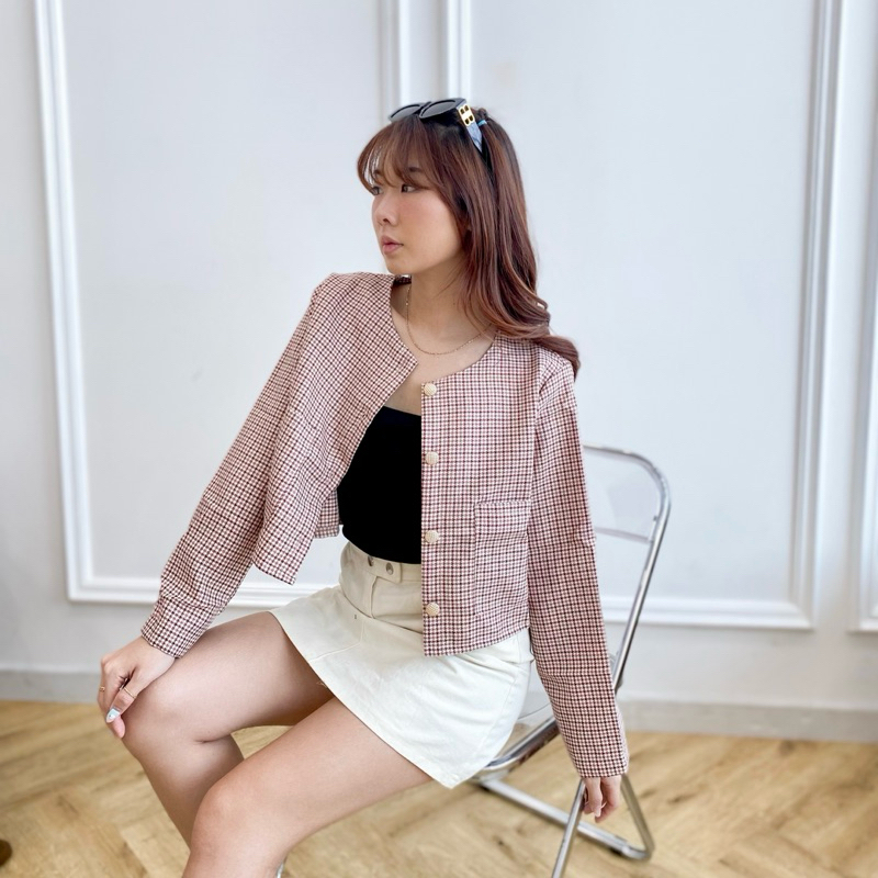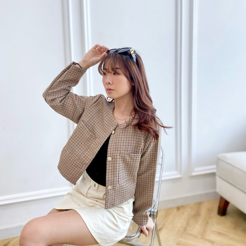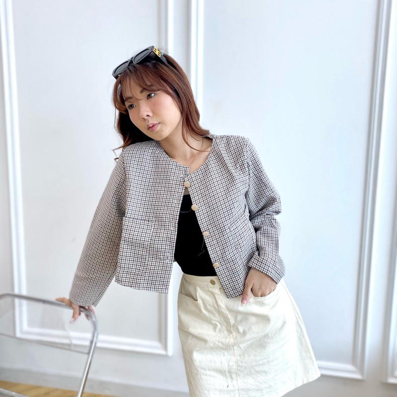 AVE 052 - NaBi Outer Blazer Crop Vintage Button | Atasan Blazer Kerja Wanita Crop Lengan Panjang Kantong 2