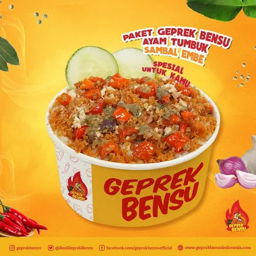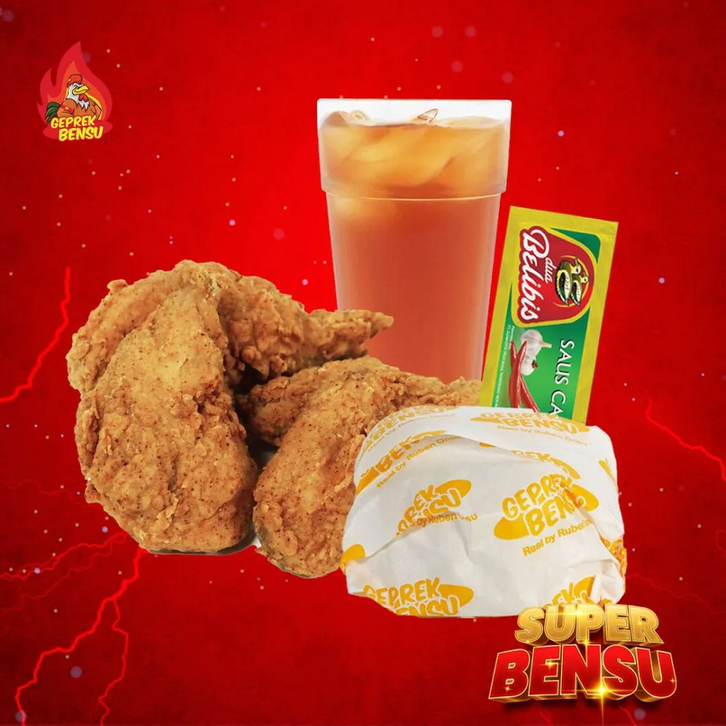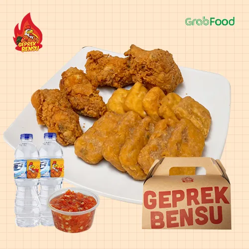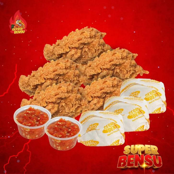 SUPER BENSU : 1 Nasi + 2 Ayam + 1 Sambal Geprek + , SUPER SADIS : 1 Nasi + 1 Winger + 1 Es teh + 1 Bel, SUPER TRIPLE : 3 Paket Geprek Bensu, SUPER 5 BENSU : 5 Ayam Geprek + 3 Nasi + 2 Sambal , Paket Geprek Bensu Sambal Original, Paket Geprek Bensu Sambal Original Lvl 15, Paket Geprek Bensu Sambal Matah, Paket Geprek Bensu Sambal Embe, Paket Geprek Bensu Nasi Daun Jeruk, Paket Geprek Bensu Leleh, Paket Geprek Bensu Saus Telur Asin, Paket Geprek Bensu Bumbu Madura Sambal Ijo, PAKET GEPREK BENSU SAMBAL MERCON, PGB Crumble + Minuman Oatside, Bundling 2 Minuman Oatside, SUPER MIX : 1/2 Nasi + 1/2 Mie + Ayam Tumbuk Samba, SUPER MIX CRUMBLE : 1/2 Nasi + 1/2 Mie + Ayam Crum, SUPER KEJU CRUMBLE : 1 Ayam Crumble + 1 Nasi + Kej, SUPER KEJU BENSU : 1 Ayam Geprek + 1 Nasi + Keju +, SUPER SADIS KEJU : 1 Nasi + 1 Winger Keju+ 1 Es te, SUPER 5 KEJU BENSU : 5 Ayam Geprek + 3 Nasi + 2 Sa, Paket Geprek Bensu Crumble Keju + Sambal Embee, Mie Geprek Bensu Sambal Original, Mie Geprek Bensu Sambal Original Lvl 15, Mie Geprek Bensu Sambal Matah, Mie Geprek Bensu Sambal Embe, Mie Geprek Bensu Leleh, Mie Geprek Bensu Saus Telur Asin, SIMPLE BOX, BIG BOSS BOX, WINGER BOX, Alacarte Geprek Bensu Sambal Original, Alacarte Geprek Bensu Sambal Original Lvl 15, Alacarte Geprek Bensu Sambal Matah, Alacarte Geprek Bensu Sambal Embe, Alacarte Geprek Bensu Leleh, Alacarte Geprek Bensu Saus Telur Asin, Paket ayam tumbuk sambal daun jeruk, Paket ayam tumbuk sambal embe, Paket mie tumbuk sambal daun jeruk, Paket mie tumbuk sambal embe, Tahu Geprek, Tempe Geprek, Terong Geprek, Nasi Putih, Jamur Geprek, Kulit Krispi, Sambal Bawang / Ori, Sambal Matah, Sambal Embe, Pudding Mangga, Lychee Cookies Oatside, Milky Choco Oatside, Mango Creamy Oatside, Bubblegum Ice Cream Oatside, Es / Hangat Teh Manis, Prima 600ml, Es Batu, Es / Hangat Teh Tawar, Teh Botol Sosro 250ml, Fruit Tea 350ml, Teh Botol Sosro 350ml, Tebs Lemon Lime, Tebs Mix Fruit, CHILLI OIL PGB NASI LV 15, CHILLI OIL PGB MIE LV 15