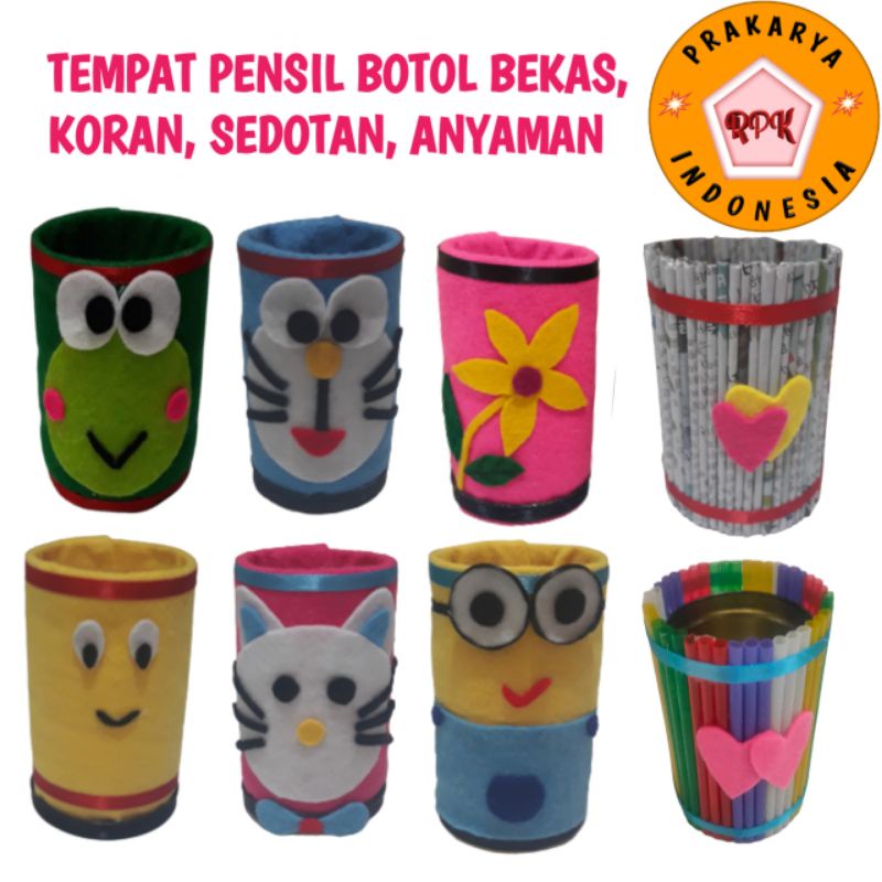 MINION, DORAEMON, Bunga, Sedotan(kaleng), Anyaman(kardus), Koran(kaleng), Benang(kardus), Mikeymouse, KREASI CAT, Ondel2, KUCING(KALENG)