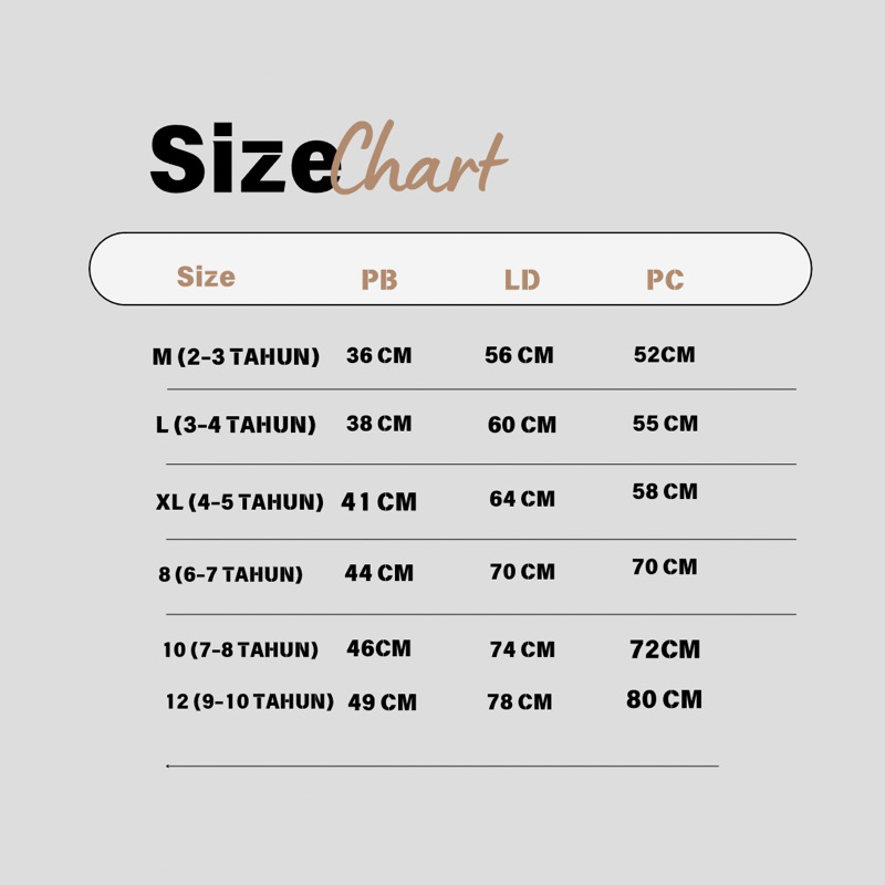 M (2-3 tahun), L (3-4 tahun), XL (4-5 tahun), 8 (6-7 tahun), 10 (7-8 tahun), 12 (9-10 tahun)