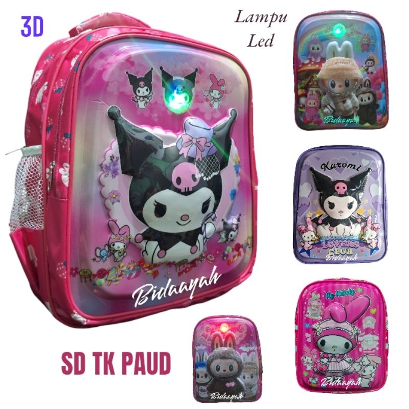 Bidaayah / KUROMI TAS ANAK SEKOLAH PEREMPUAN 3D EMBOS LAMPU LED SD/ TK /PAUD ( DUA RUANG ) BERAGAM KARAKTER PEREMPUAN