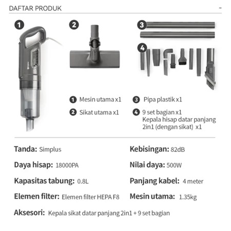 Simplus Vacuum Cleaner Genggam Berdiri 2 IN 1,16000Pa Filter HEPA Ringan 1kg Aksesori 9pcs